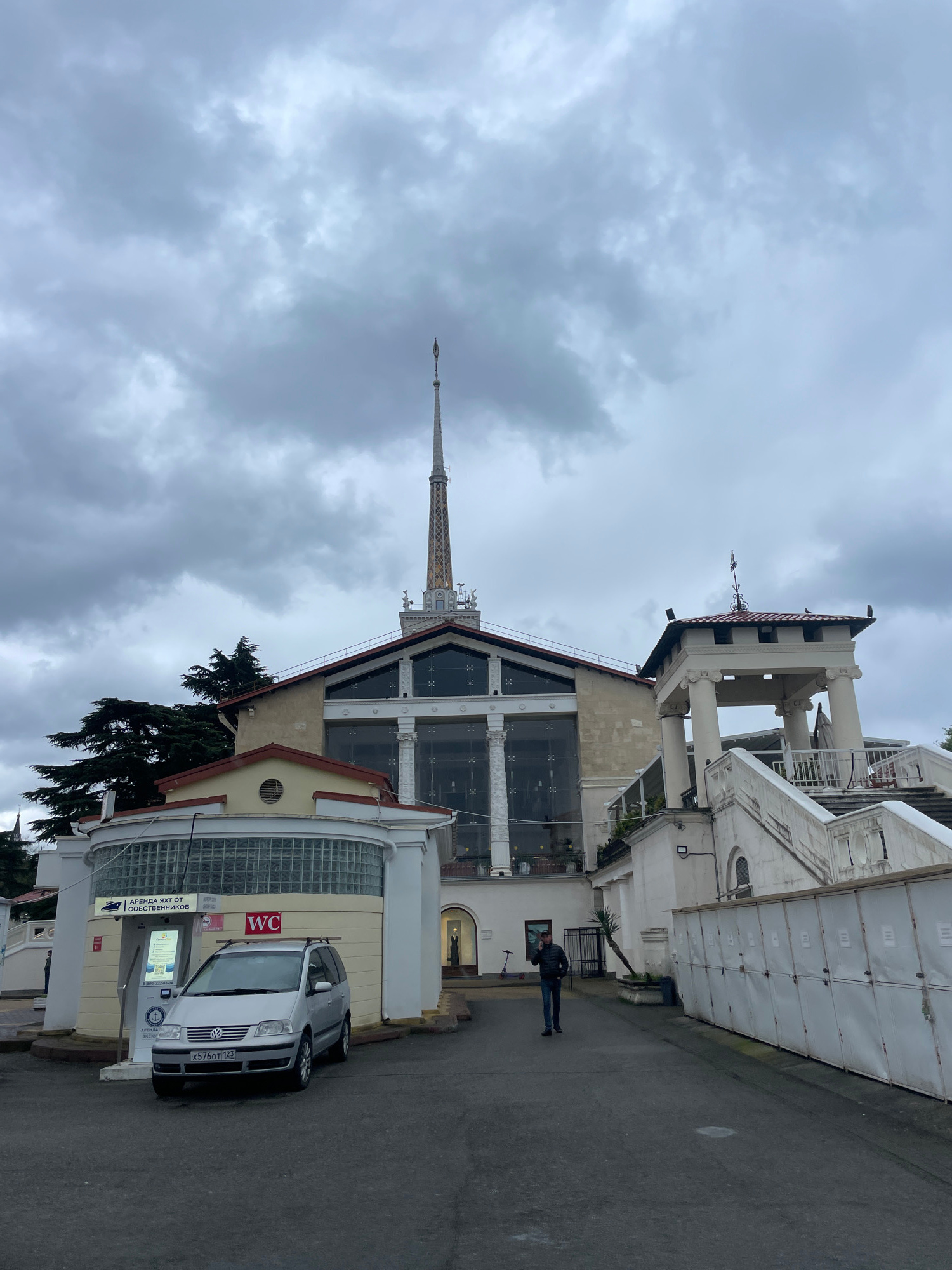 The image shows a street scene in Sochi, Russia. The sky is overcast with dense, grey clouds. On the right side of the frame is a multi-story building with a variety of architectural styles, includingβ¦read more