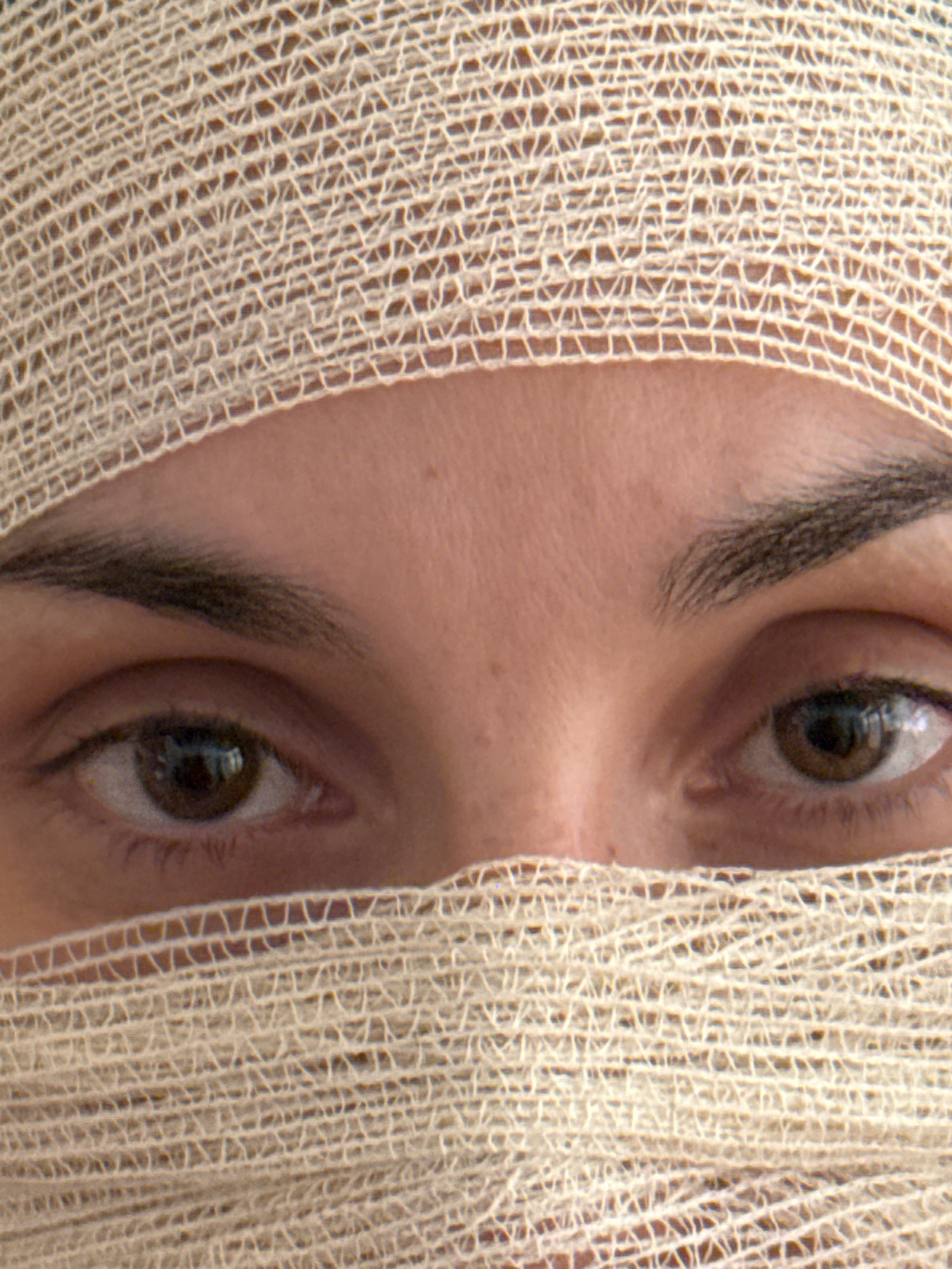 A close-up shot depicts a person's face, primarily focusing on the eyes, which are partially obscured by a light-colored, woven material resembling gauze or netting. The skin is light-toned, with visiβ¦read more
