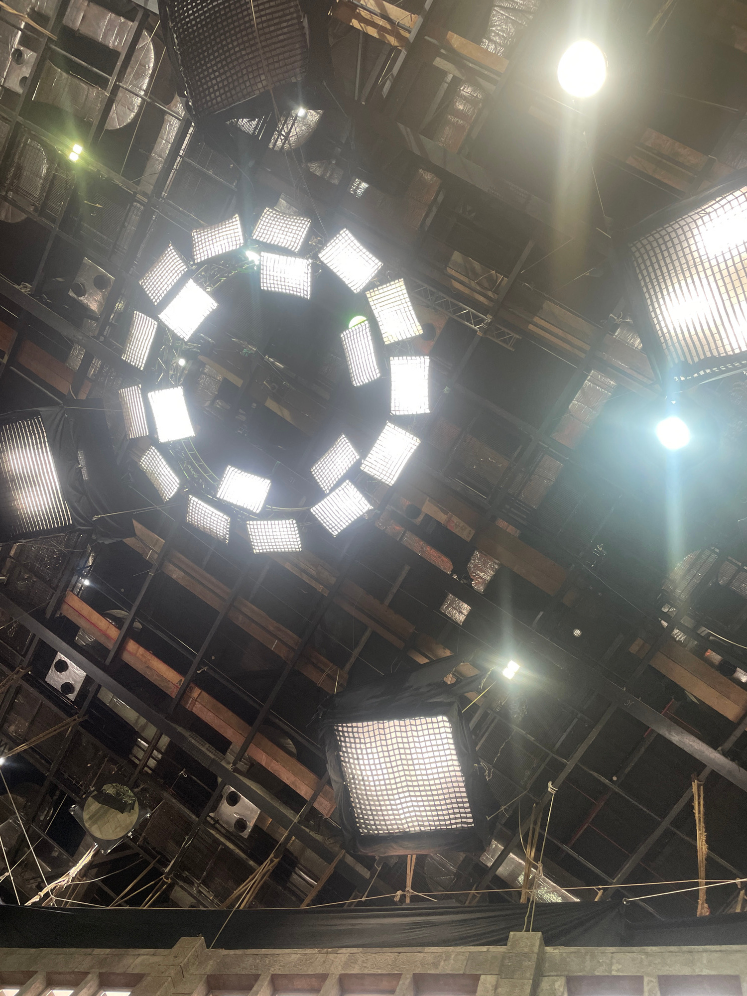 The image depicts an indoor scene under a complex array of stage lighting. The location appears to be a film or television studio. Above, numerous lighting grids and units are visible, with a prominen…read more