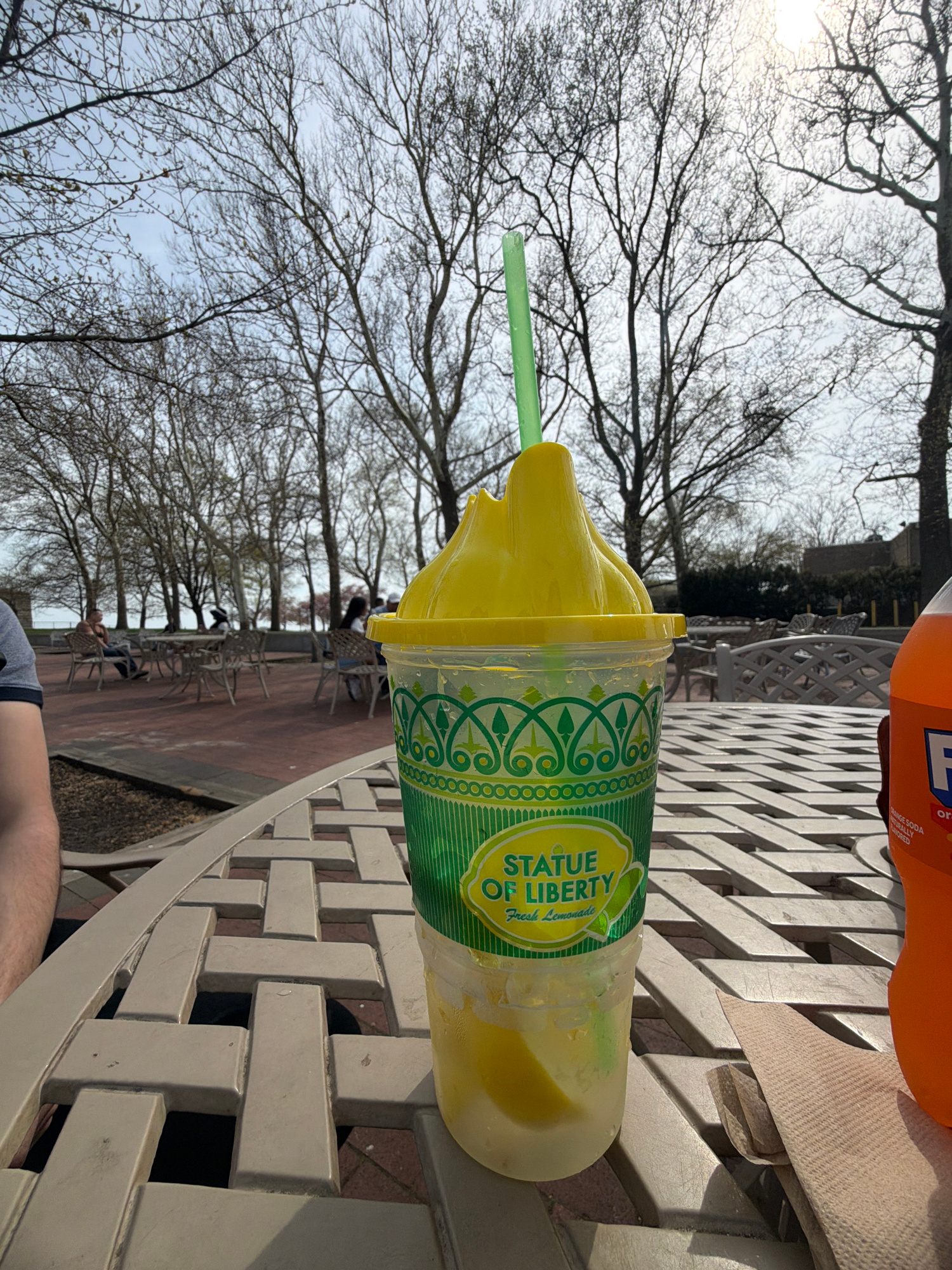 The image, viewed upright, features a bright yellow frozen drink in a clear plastic cup with a green straw, resting on a light-colored, woven-patterned outdoor table. To the right, a partially visible…read more