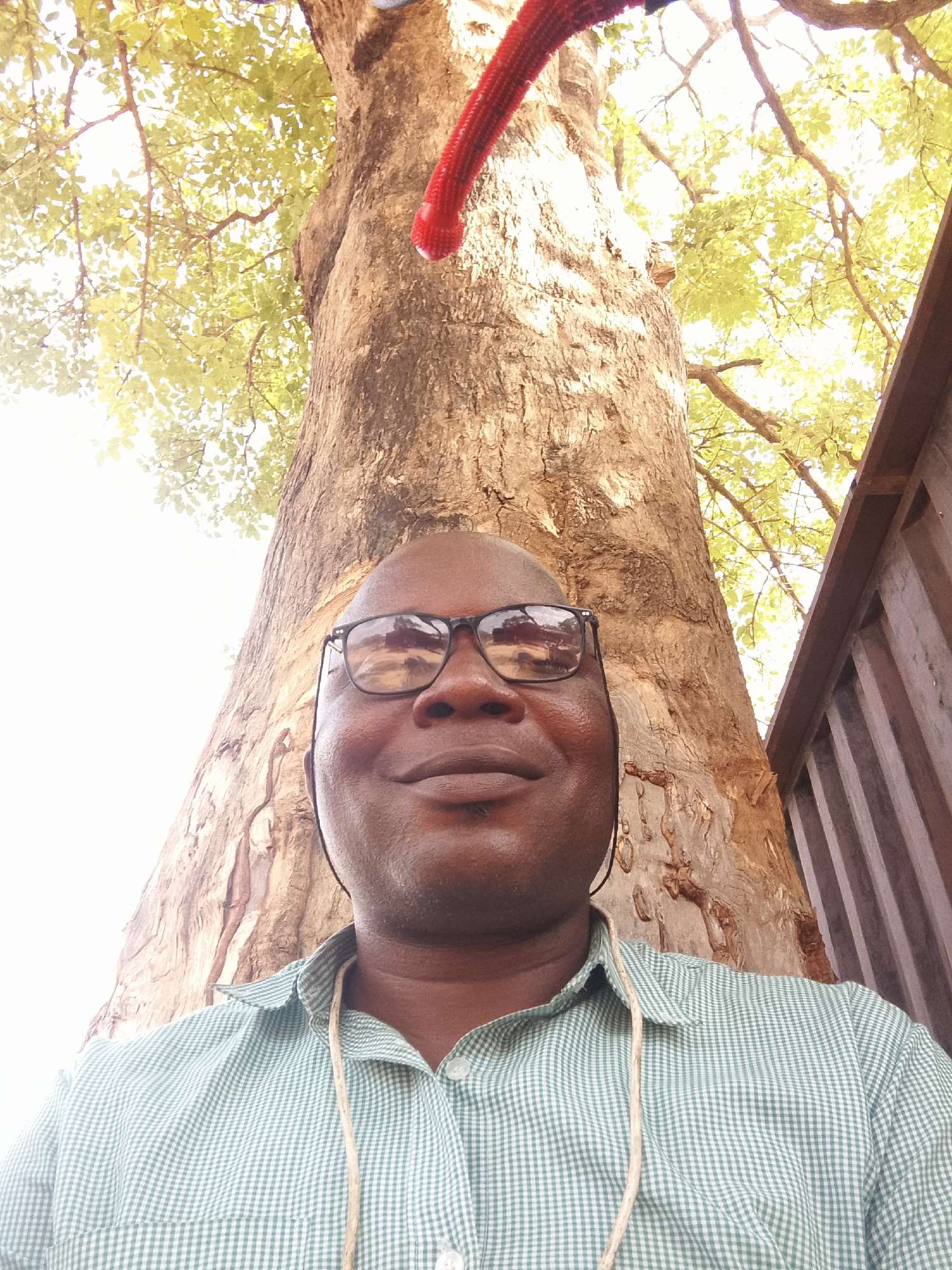 The image depicts a man with dark skin and a shaved head, wearing glasses and a green and white checkered shirt with a lanyard. He is standing in front of a large tree with brown bark and green leaves…read more