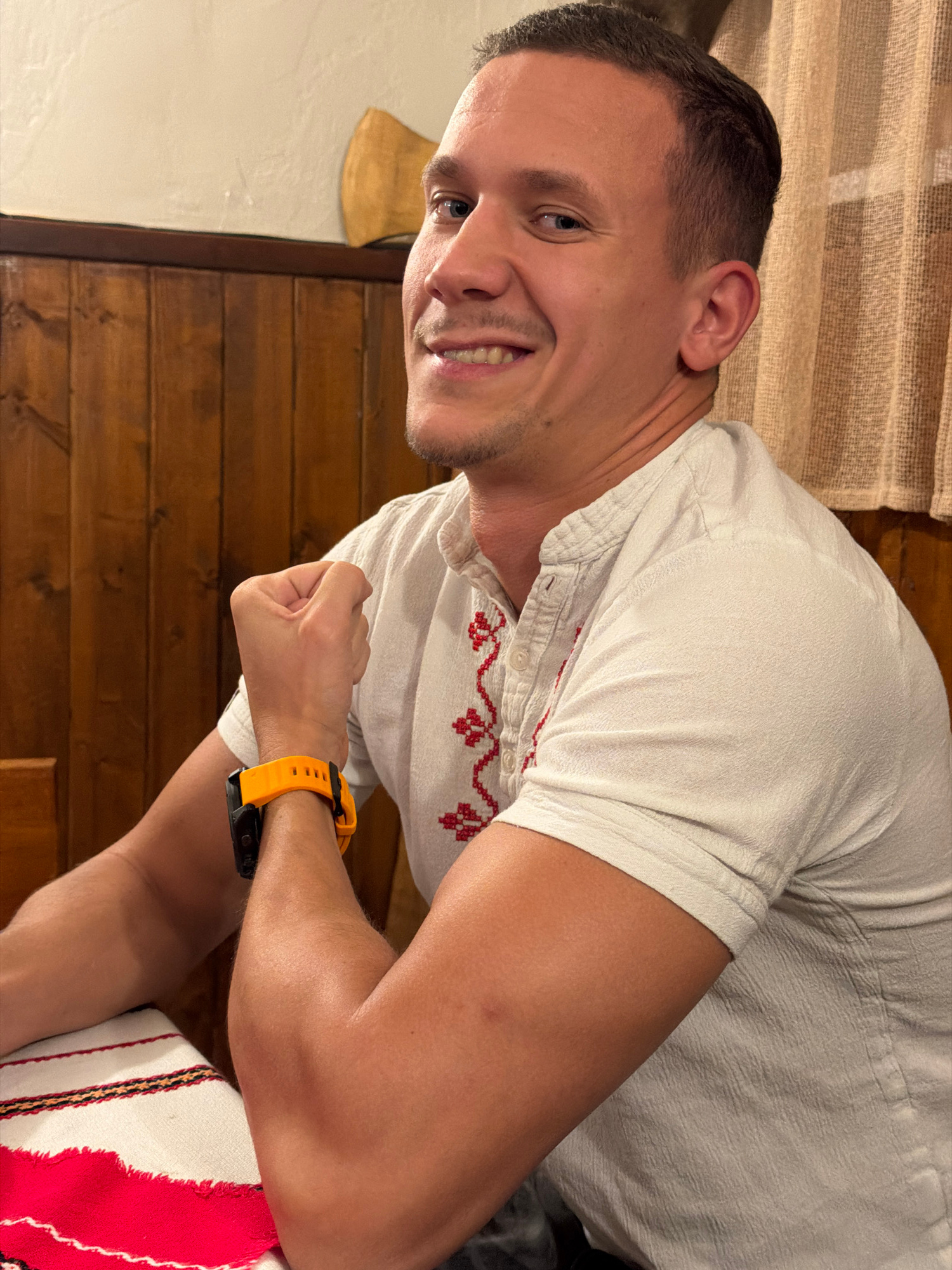 A man is posing for a photograph in an indoor setting, likely within a traditional Bulgarian-themed establishment. He has fair skin, short brown hair, and is wearing a white shirt with red embroidered…read more