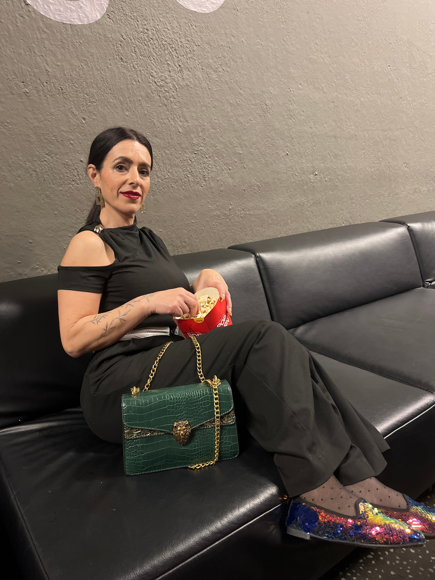 A woman is reclining on a black leather sofa, holding a red container of popcorn in her hands. She is wearing black trousers, a black top with a cut-out shoulder, and sequined shoes. She also has a gr…read more