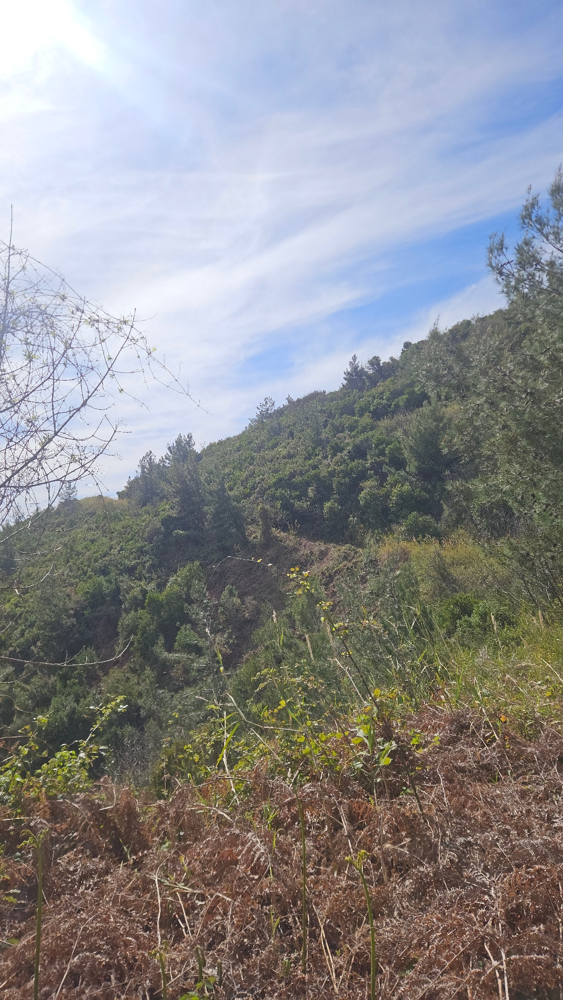 The image shows a landscape in Budva, Montenegro. The sky is blue with wispy white clouds. A densely vegetated hillside dominates the frame, composed of green trees and undergrowth transitioning into…read more