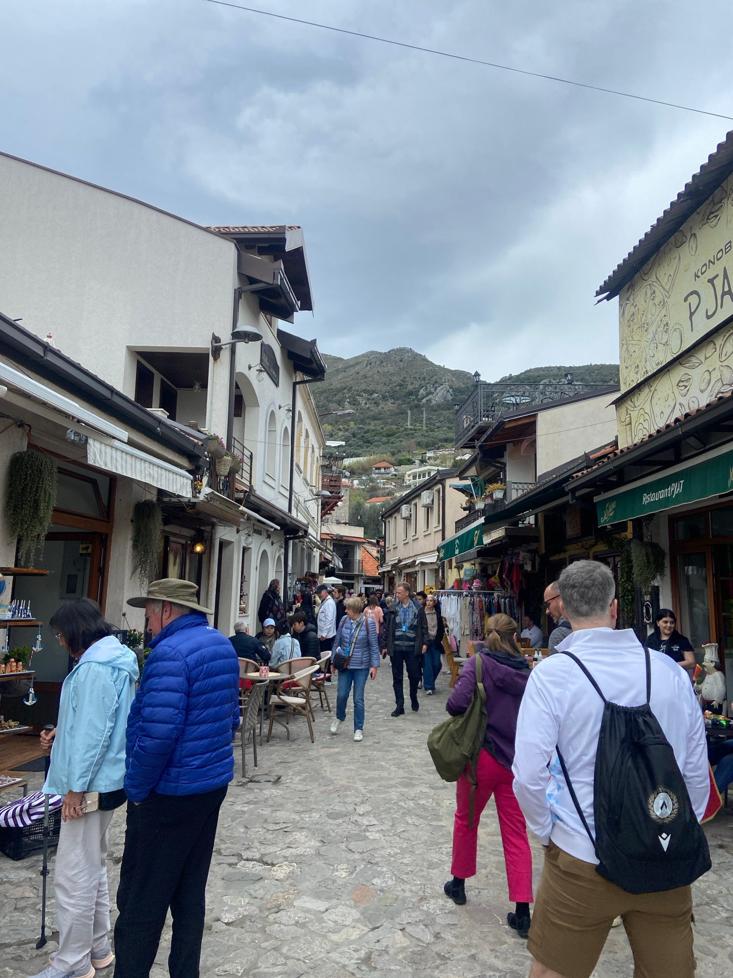 The image shows a street scene in Stari Bar, Montenegro, with a view down a pedestrianized lane flanked by buildings with shops and restaurants. Numerous people are walking through the street, includi…read more