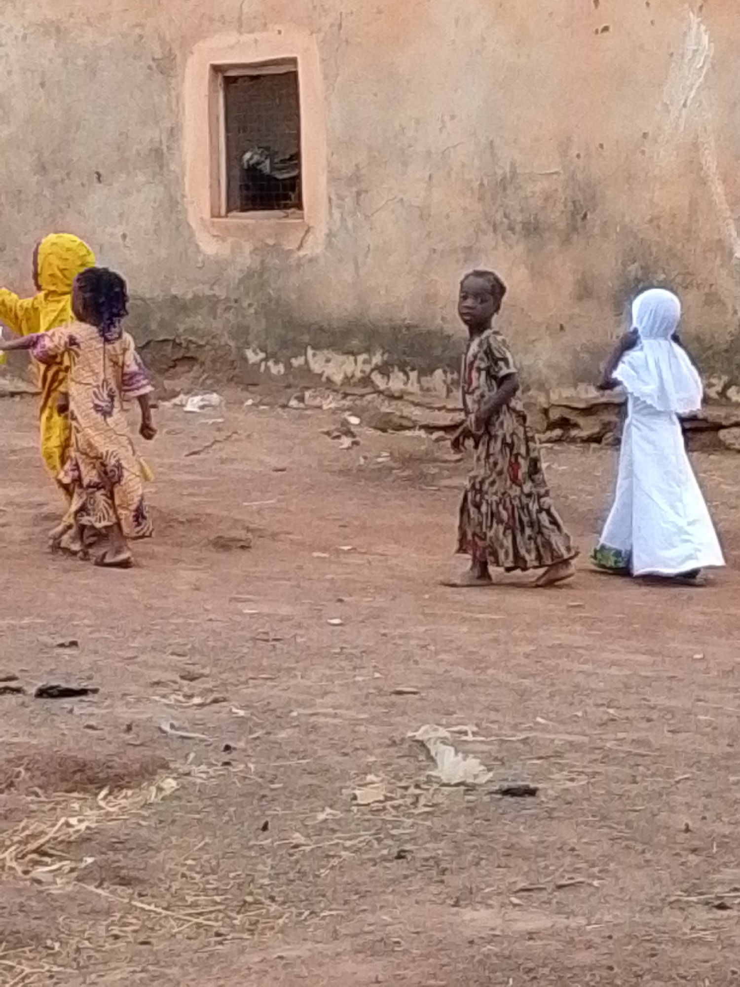 In Tamale, Ghana, four children stand in a dusty open area in front of a weathered building with a small, barred window. The children are dressed in traditional clothing: one in a yellow hooded outfit…read more
