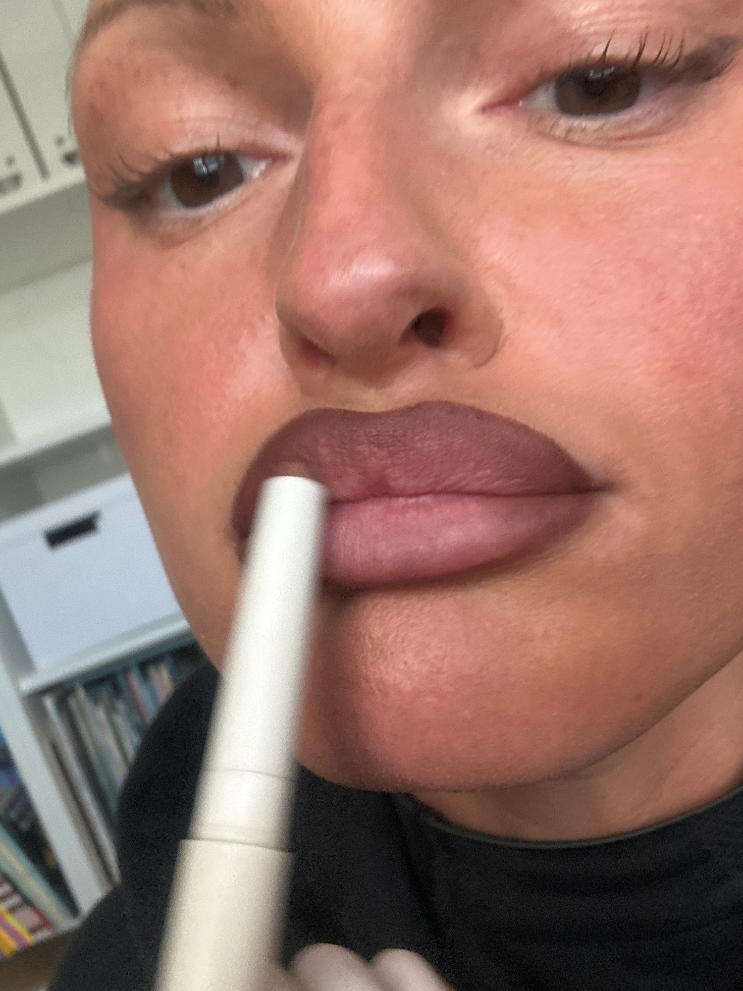 The image presents a close-up forensic view of an individual applying a cosmetic product to their lips, located indoors in Wealden, United Kingdom. The subject has medium skin tone, prominent eyelashe…read more