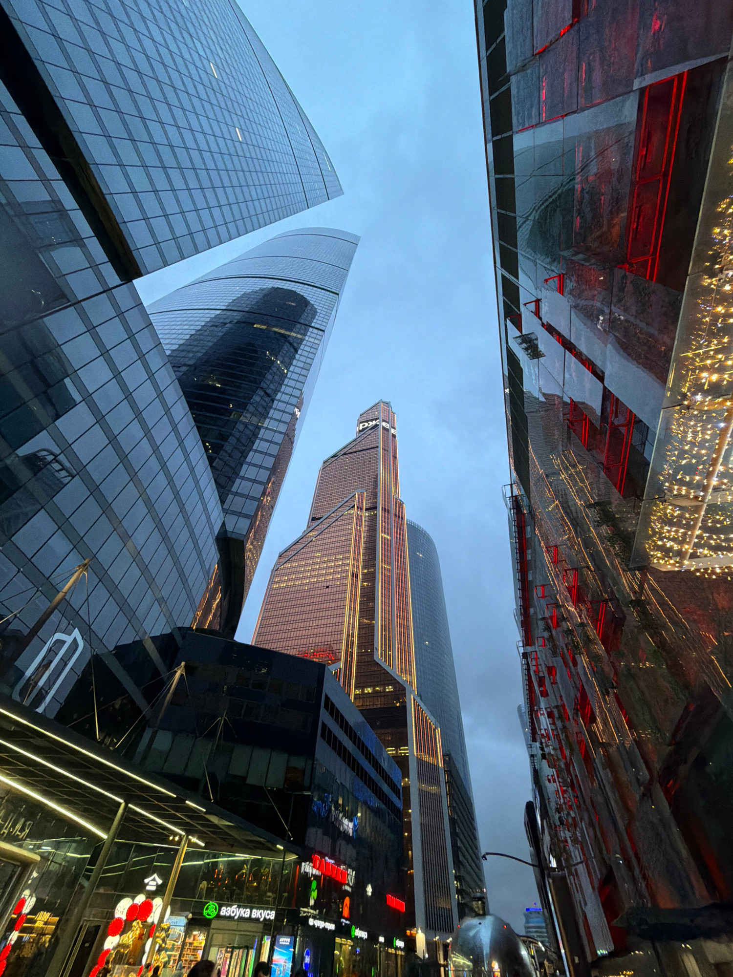 The image depicts a low-angle view of several modern skyscrapers in a city, presumably Khimki, Russia. The buildings are predominantly constructed with glass and metal, reflecting the overcast sky and…read more