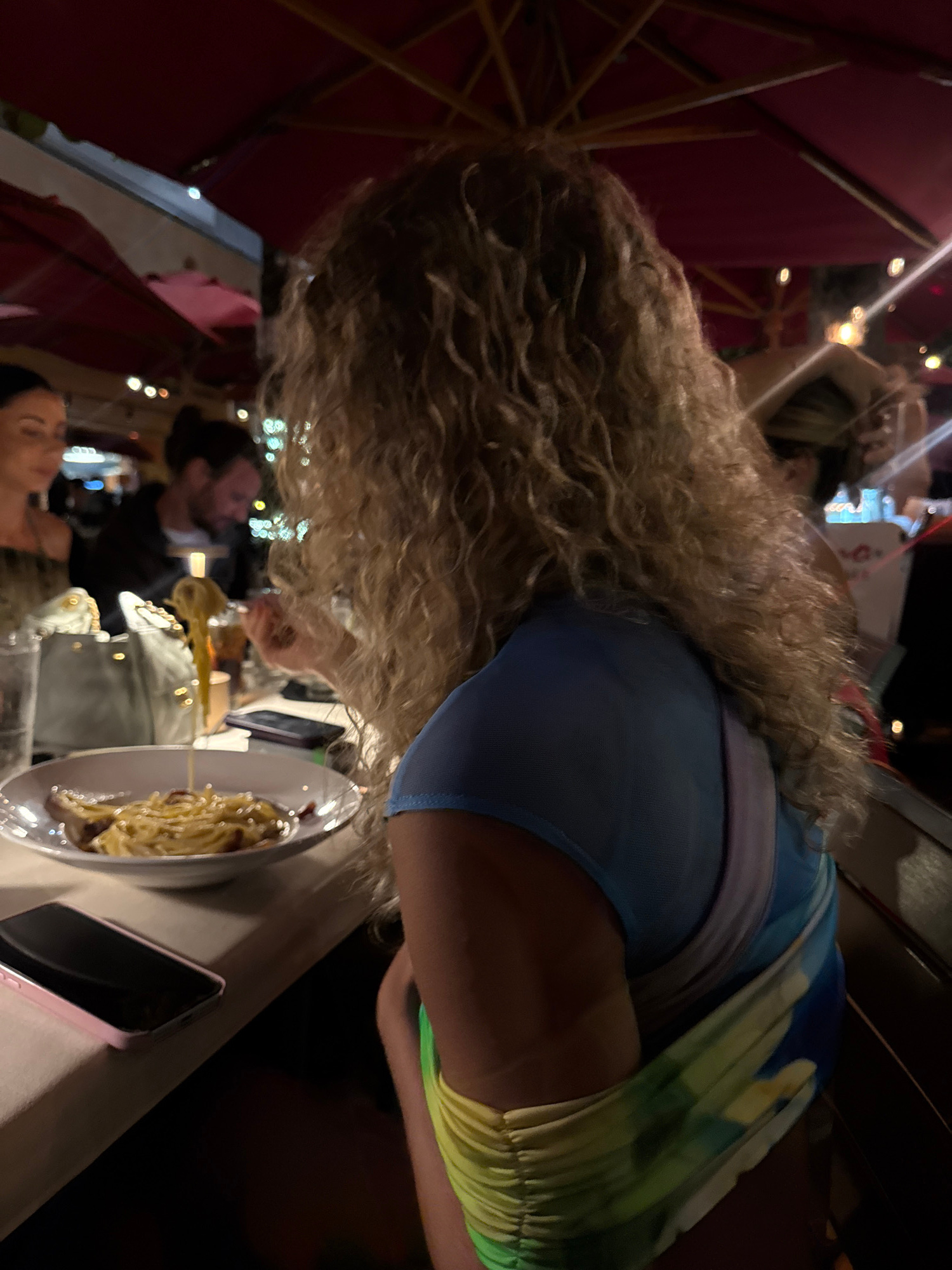 At an outdoor restaurant in Honolulu, United States of America, a person with long, curly blonde hair leans over a plate of pasta. The person wears a blue and green dress. On the table, a phone with a…read more