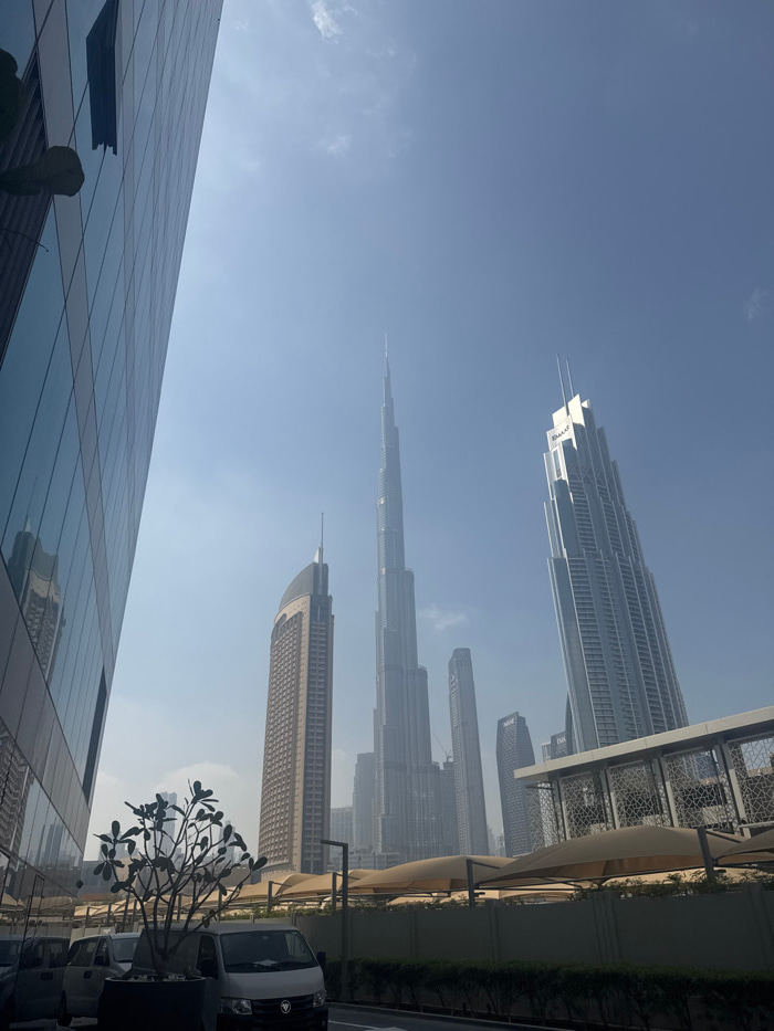 Dubai's skyline is depicted from a low angle, emphasizing its towering skyscrapers against a hazy blue sky. The Burj Khalifa dominates the view, flanked by other high-rise buildings. Reflections of st…read more