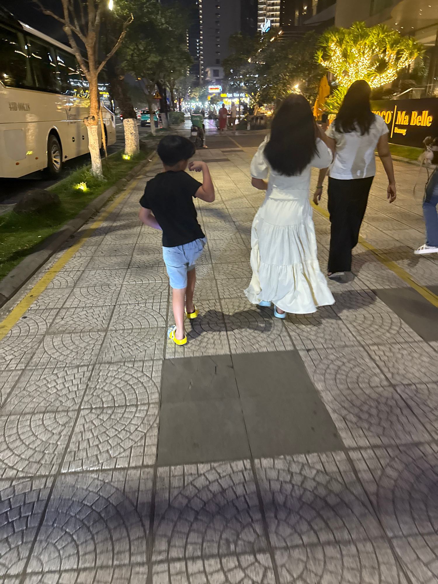 The photograph, taken at night, shows a street scene in Đà Nẵng, Vietnam. Pavement with a circular pattern makes up the foreground. A child in a black shirt, blue shorts, and yellow shoes stands on th…read more