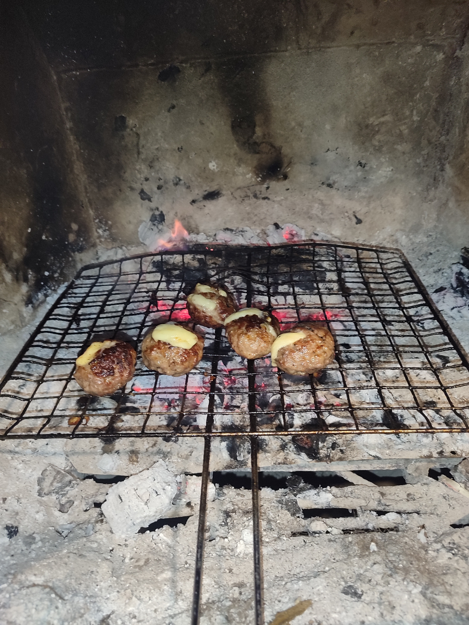 The image depicts a rudimentary indoor grill setup, possibly within a fireplace. On a metal wire grill, four cooked, round patties are placed, each topped with a yellowish substance that appears to be…read more
