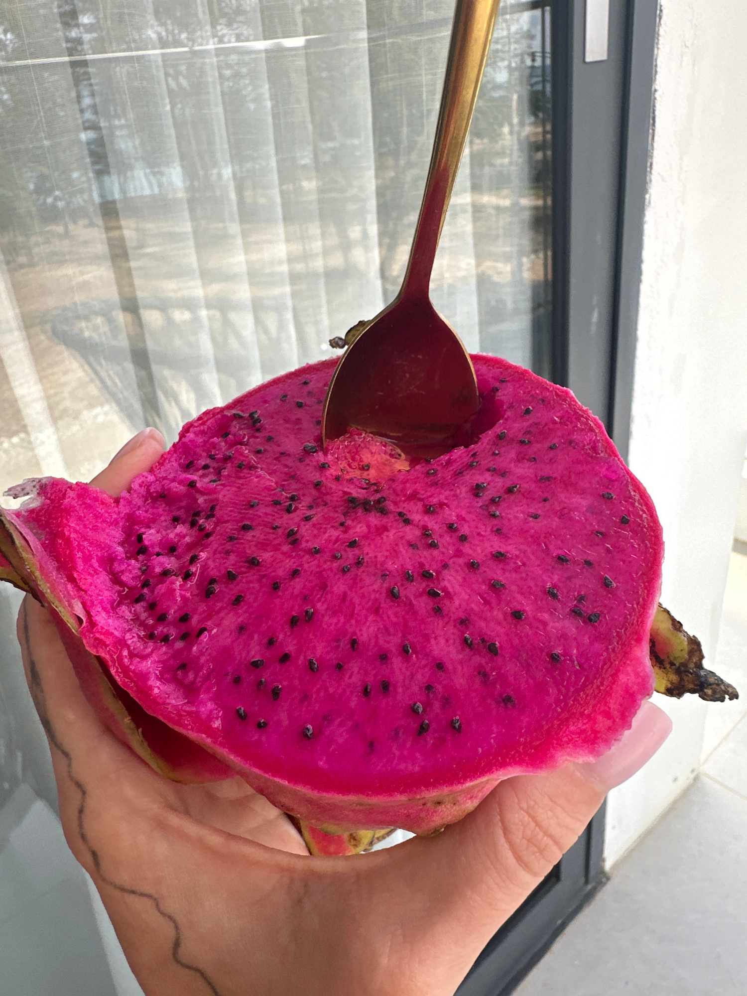 A partially eaten, halved dragon fruit with bright pink flesh and black seeds is held in a person's hand with long, manicured nails. A golden spoon is inserted into the fruit. The setting appears to b…read more
