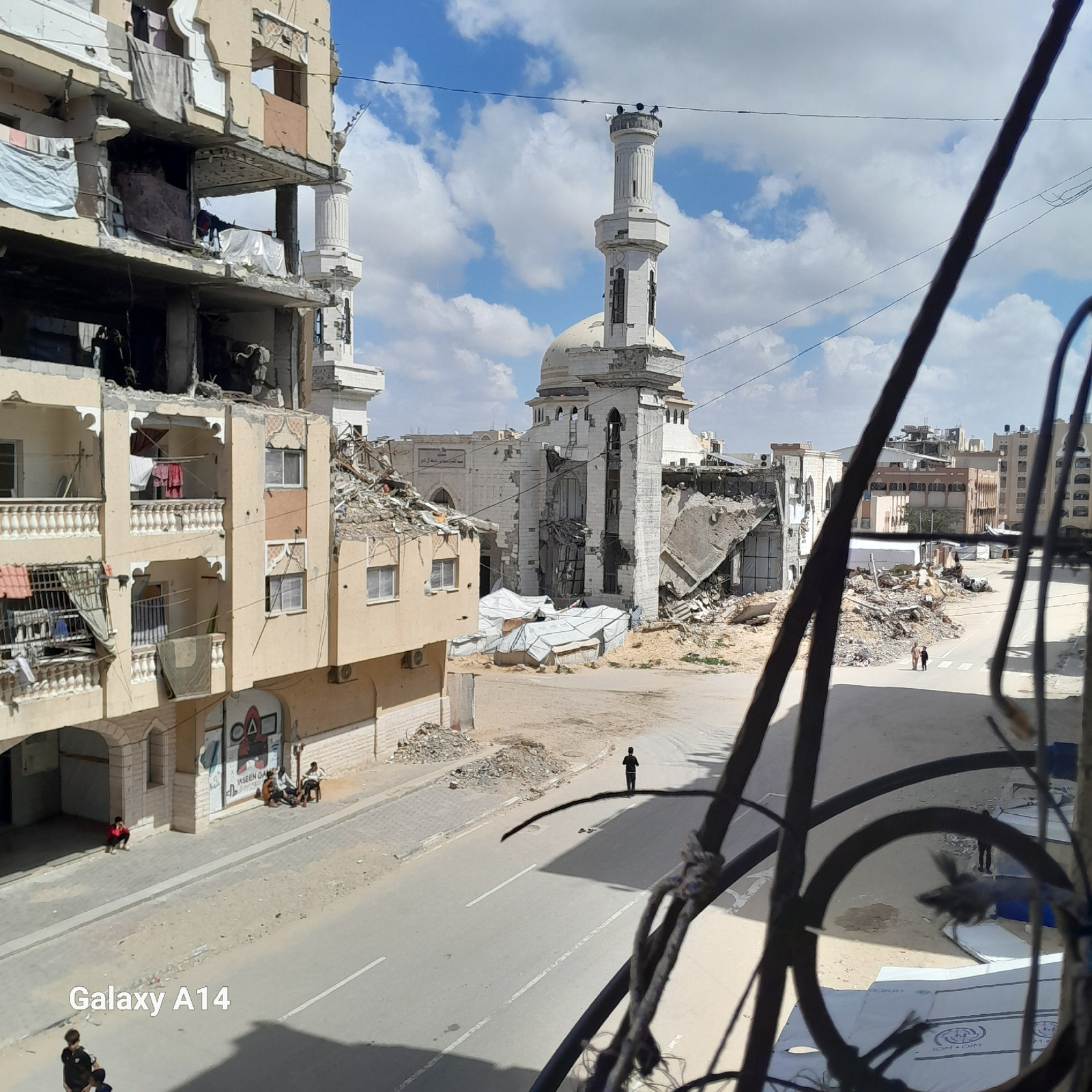 The image depicts a scene of urban devastation in Unknown, Unknown. A partially destroyed mosque with a minaret stands amidst damaged buildings. Debris is scattered along the street. A few individuals…read more