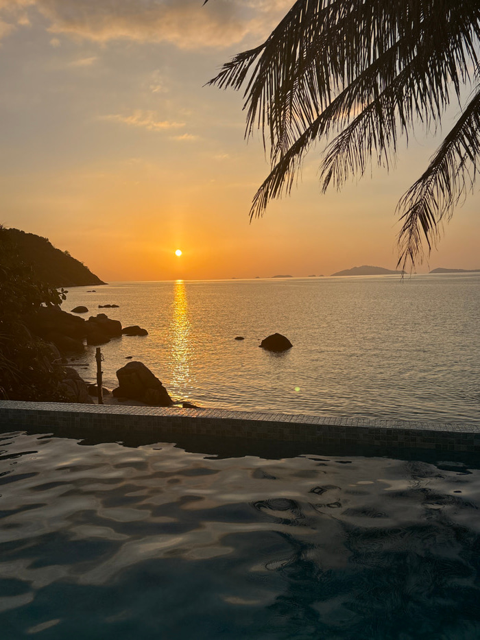 The scene depicts a sunset over the Andaman Sea from Ban Ko Li Pe, Thailand. In the immediate foreground, the rippling, dark blue water of a swimming pool is visible, bordered by a tiled edge consisti…read more