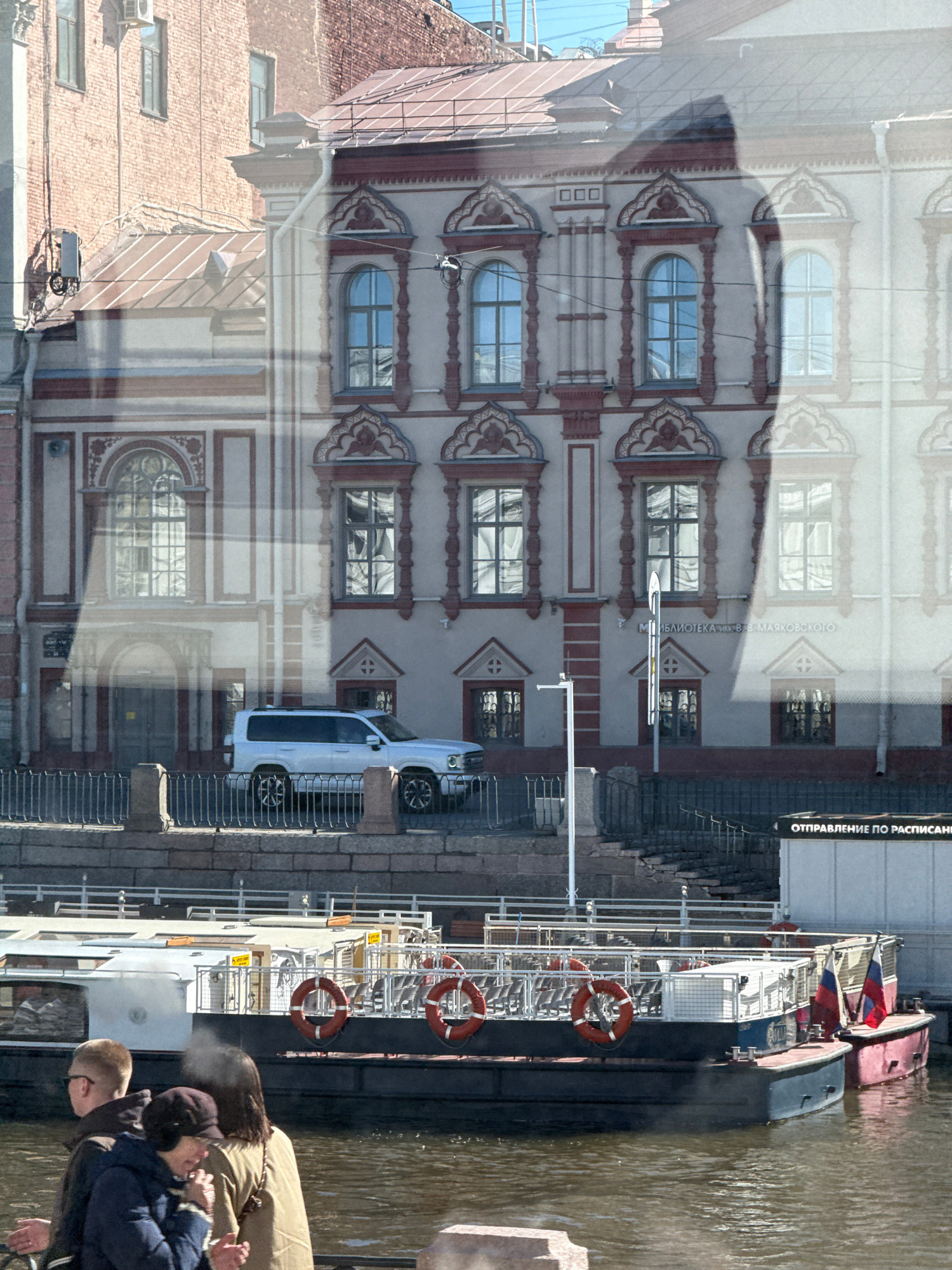 The image shows a view, possibly from a boat on a canal, towards a building at 8 Mayakovsky street in Saint Petersburg, Russia. The building features distinct architectural details with red and white…read more