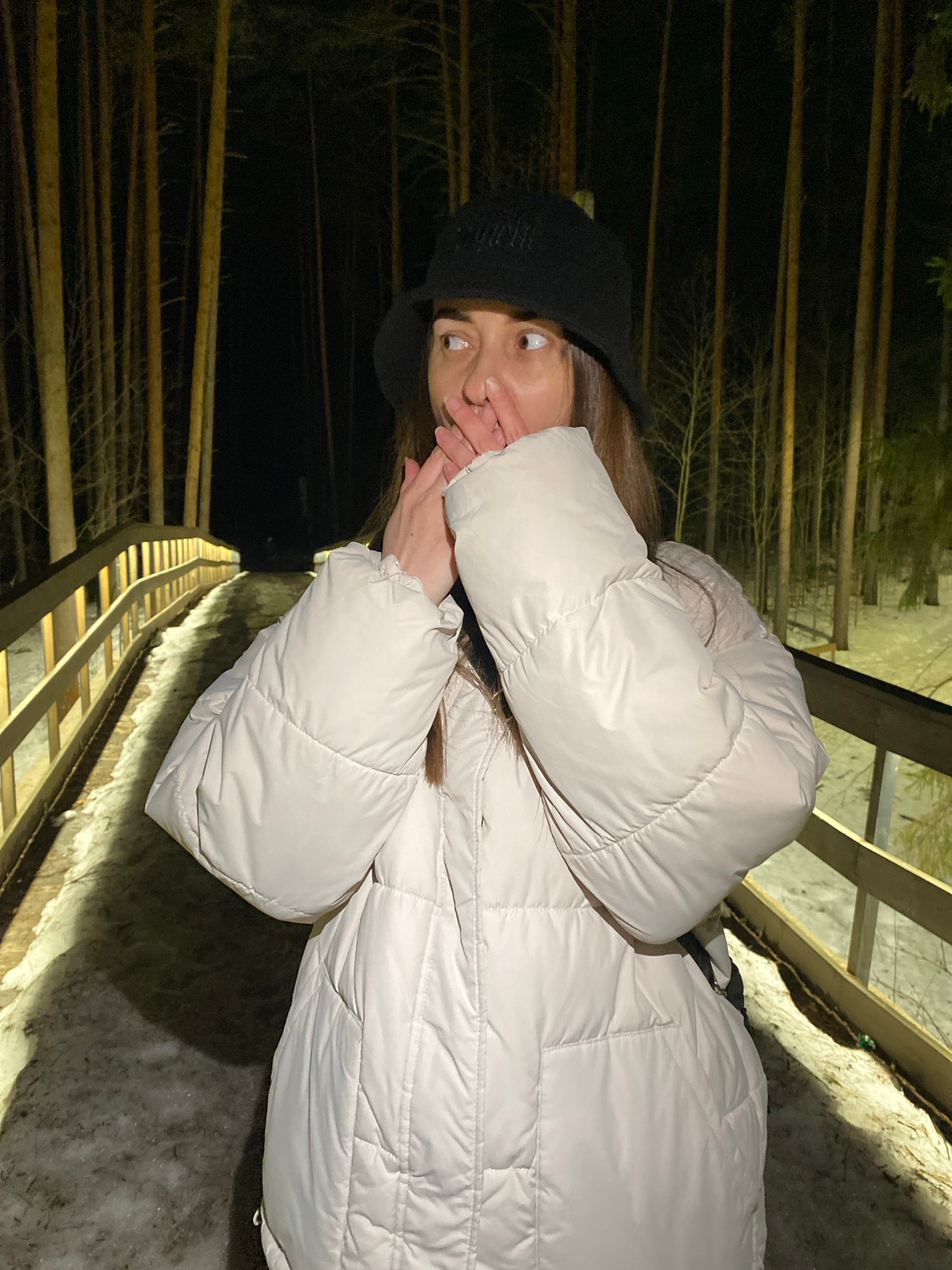 A person wearing a black beanie and a light-colored puffer jacket stands on a wooden walkway in an outdoor setting that appears to be a park or wooded area at night. The person is covering their mouth…read more