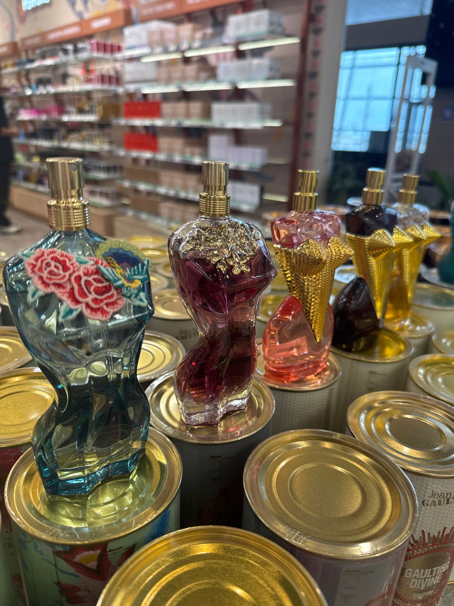 The image depicts a display of Jean Paul Gaultier perfume bottles arranged on top of cylindrical cans. The bottles, varying in color, are shaped like a woman's torso and feature ornate, gold-colored c…read more