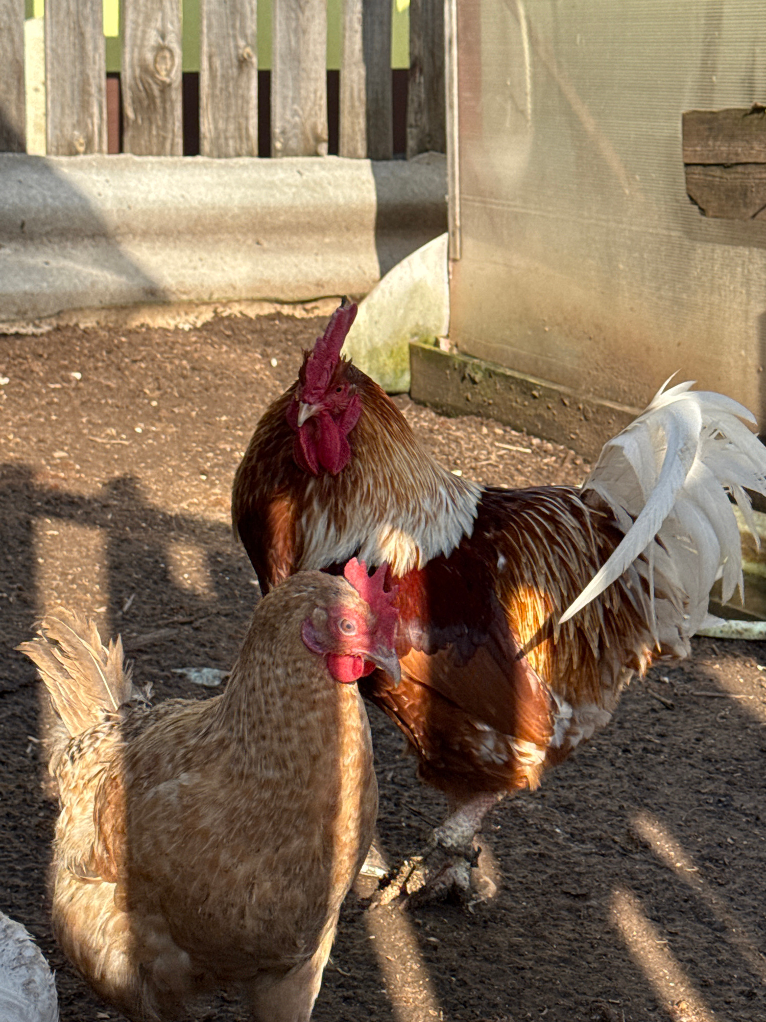 The image shows a rooster and a hen in a dirt enclosure. The rooster has brown and white feathers and a red comb. The hen is light brown. The enclosure is adjacent to a wooden structure with a corruga…read more