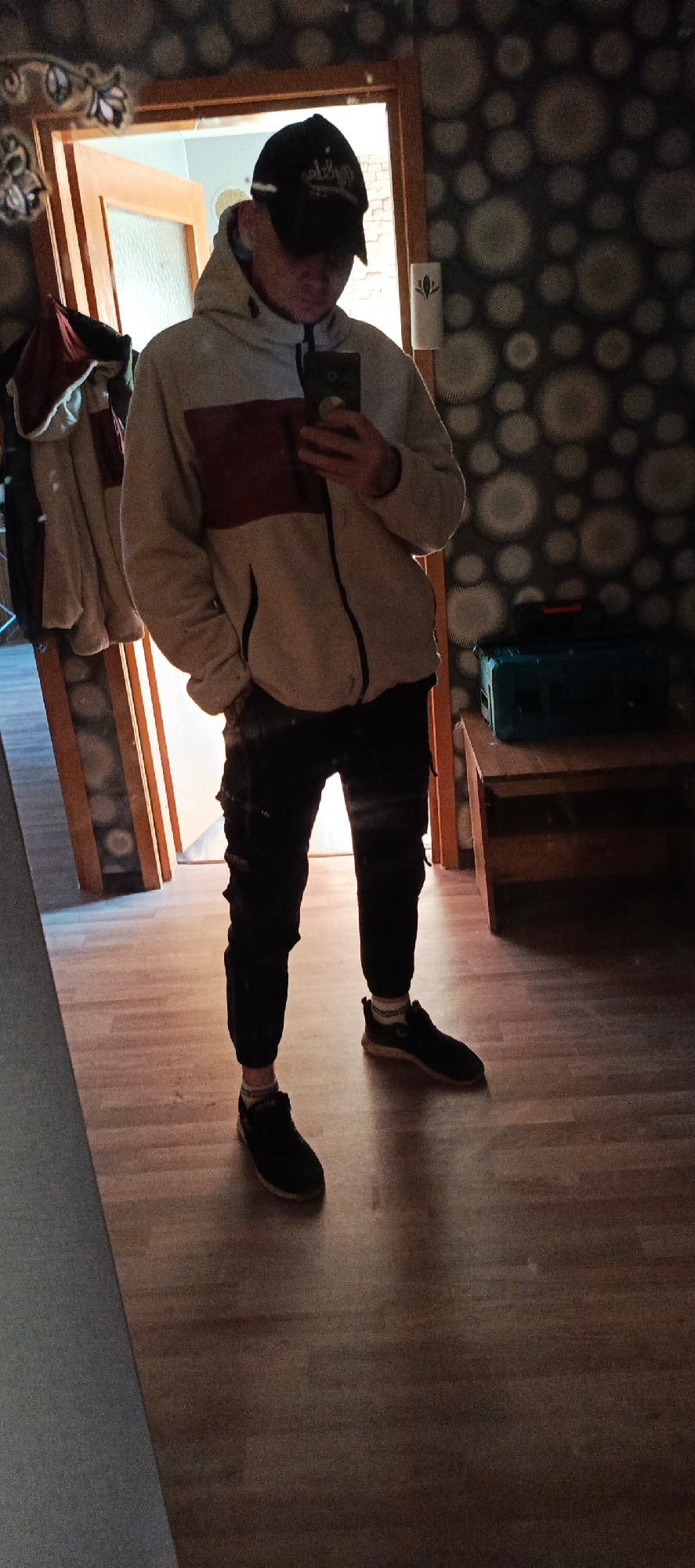 A person is seen in a mirror taking a selfie indoors. The person is wearing a black baseball cap, a grey and red hoodie, black pants, and black shoes. They are holding a smartphone in their right hand…read more