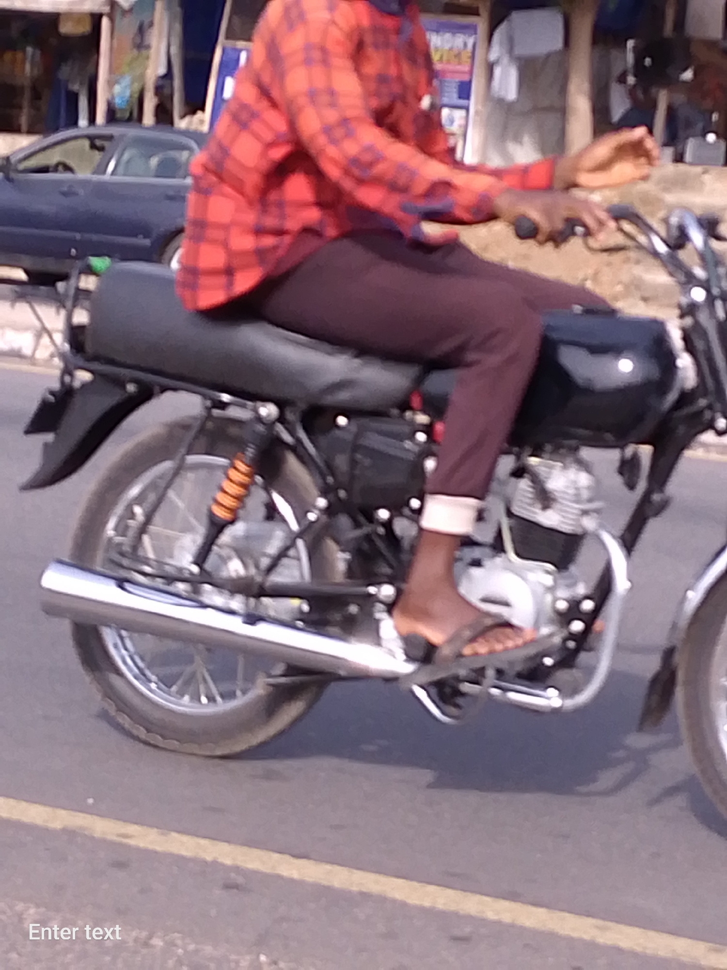A person wearing a red checkered shirt and maroon pants is riding a motorcycle on a paved road. The motorcycle has a black gas tank and seat, with chrome exhaust and fenders. The rider is wearing sand…read more