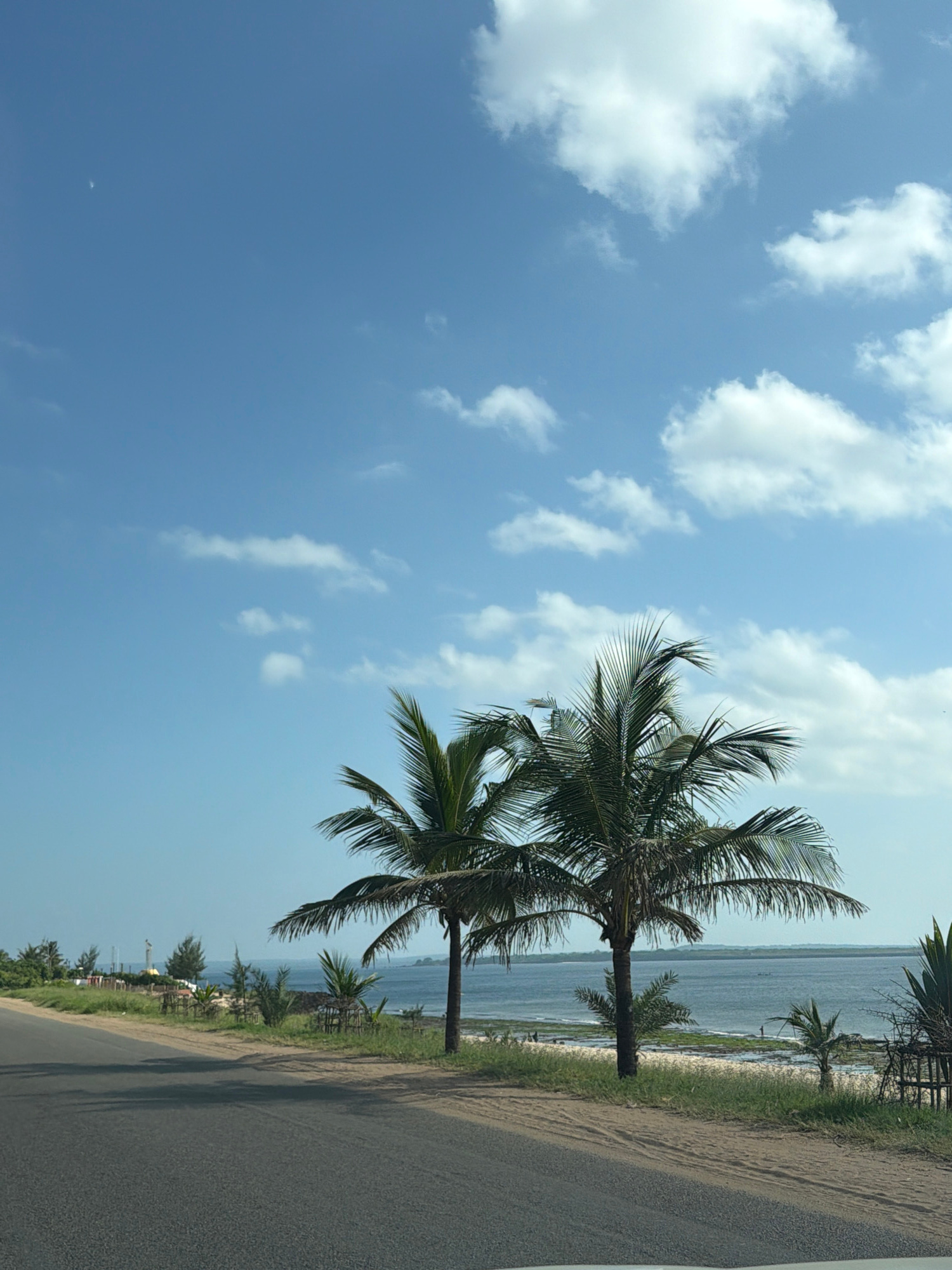 The image presents a serene tropical coastal landscape, likely in Pemba, Mozambique, under a bright, clear sky. The scene is dominated by a vivid blue sky, dotted with scattered white cumulus clouds,…read more