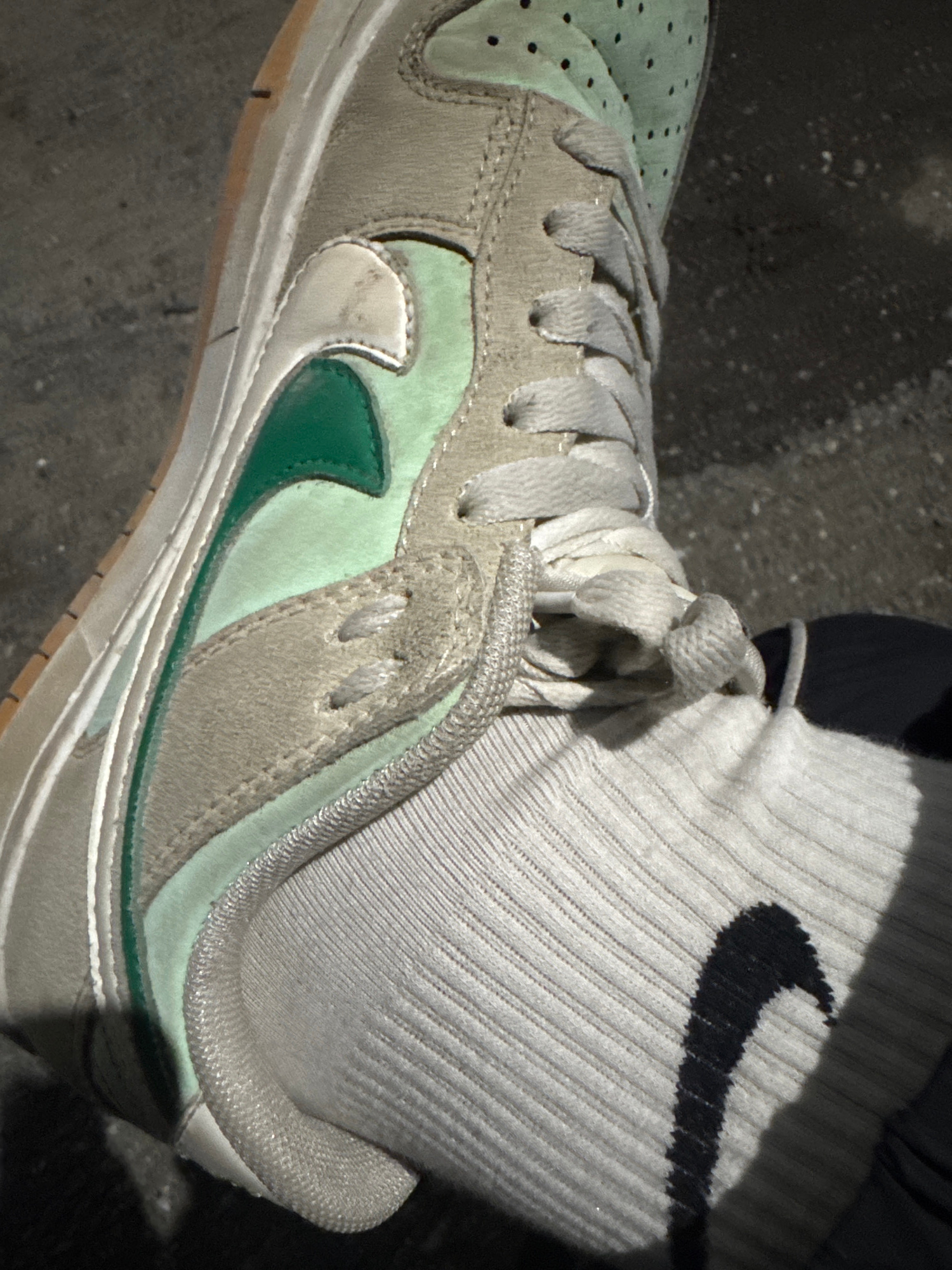 A close-up shot of a sneaker on a foot wearing a white sock. The sneaker is primarily gray suede with light green panels and a dark green Nike swoosh. The sock is a ribbed crew sock with a black Nike…read more