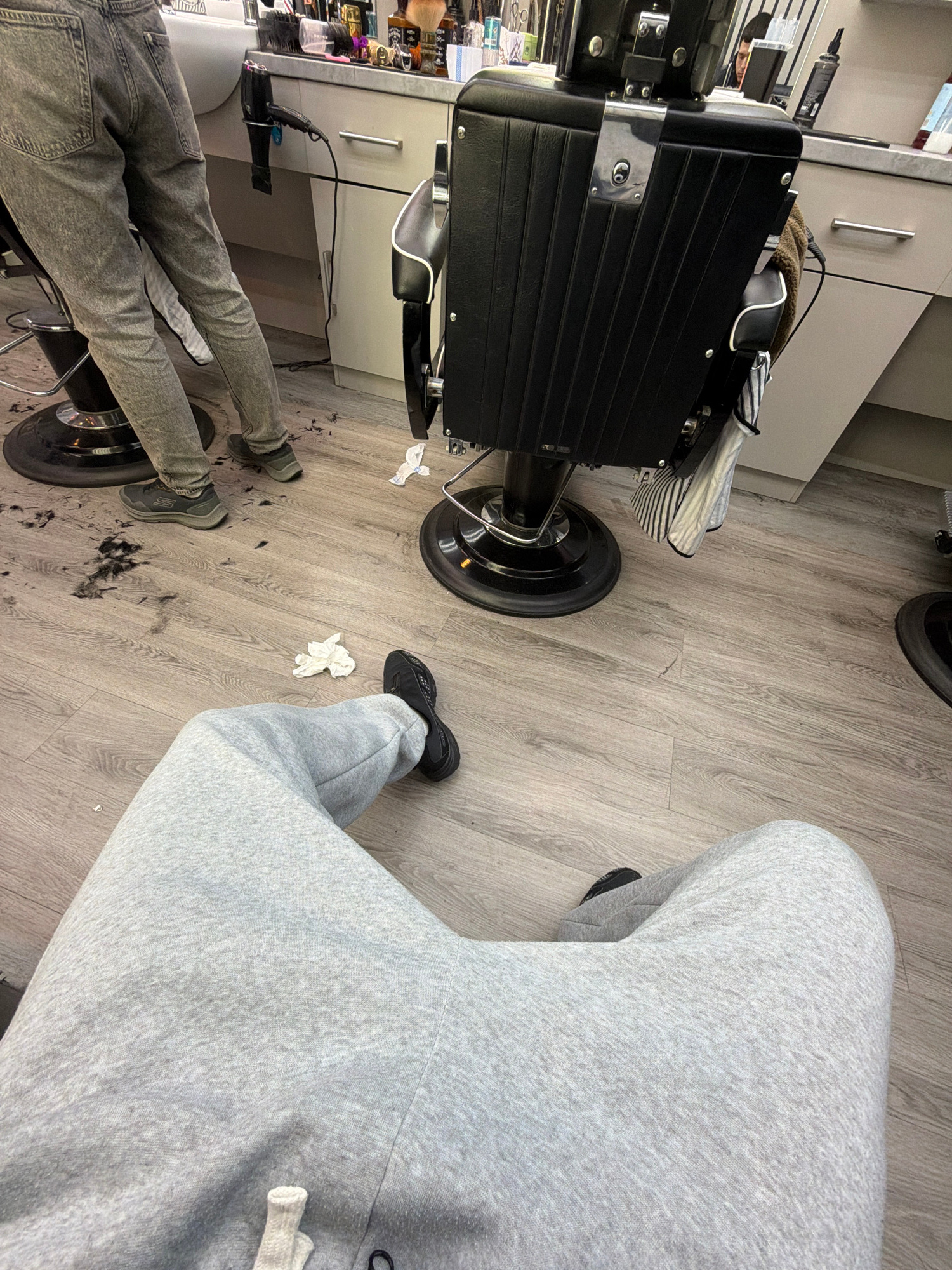 The image depicts an indoor scene, likely a barbershop. Two individuals are partially visible. One is wearing light grey sweatpants and black sneakers, their legs extending into the frame. The other pā¦read more