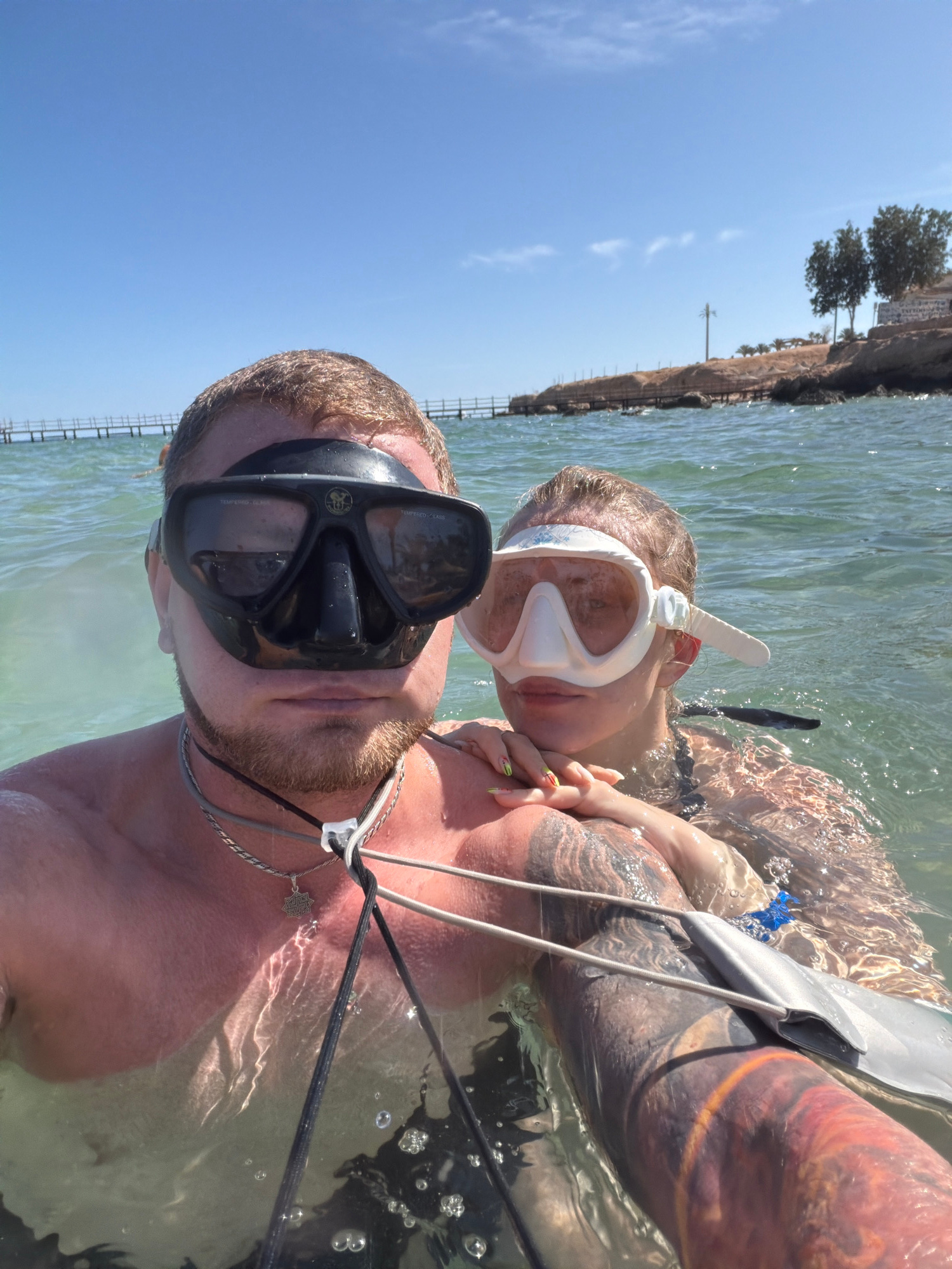 The image depicts two individuals partially submerged in clear, greenish-blue ocean water under a bright, largely cloudless blue sky, consistent with the coastal environment of Sharm El Sheikh, Egypt.…read more