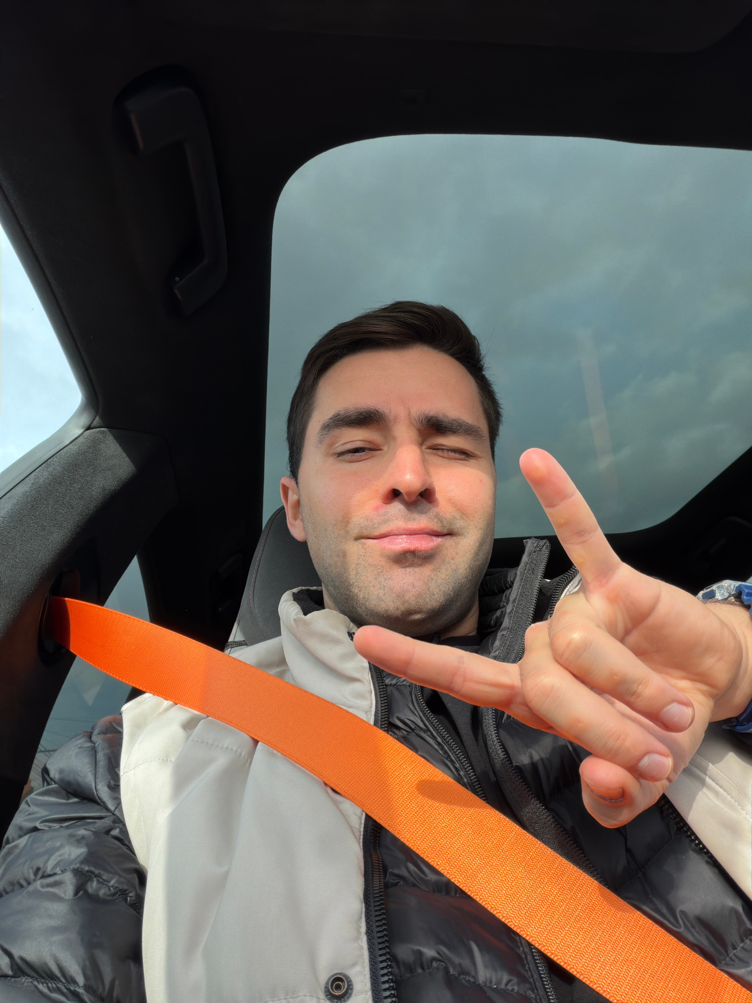 The image, rotated approximately 90 degrees counter-clockwise, captures a man taking a selfie inside a car in Krasnoyarsk, Russia, during the daytime. The man, appearing to be in his 20s or 30s, has sā¦read more
