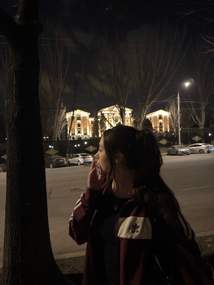 A woman is photographed outdoors at night. She wears an Adidas jacket, and her hair is up. In the background are three lighted buildings with decorative fencing and streetlights, plus parked cars on t…read more