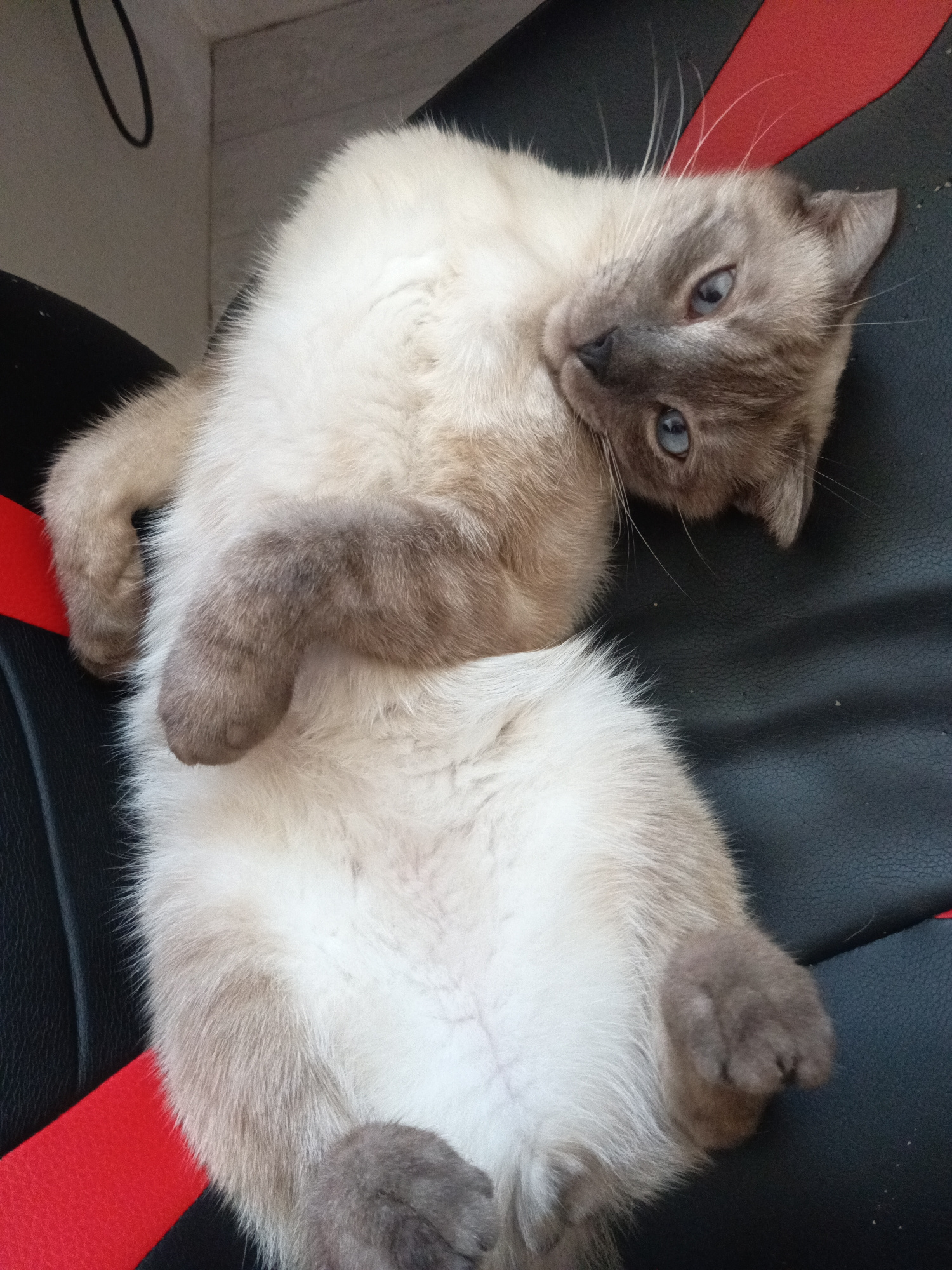 A light-beige cat with gray markings lies on its back on a black and red padded surface, possibly a chair. The cat's paws are curled up, and it is looking at the camera. The location cannot be determi…read more