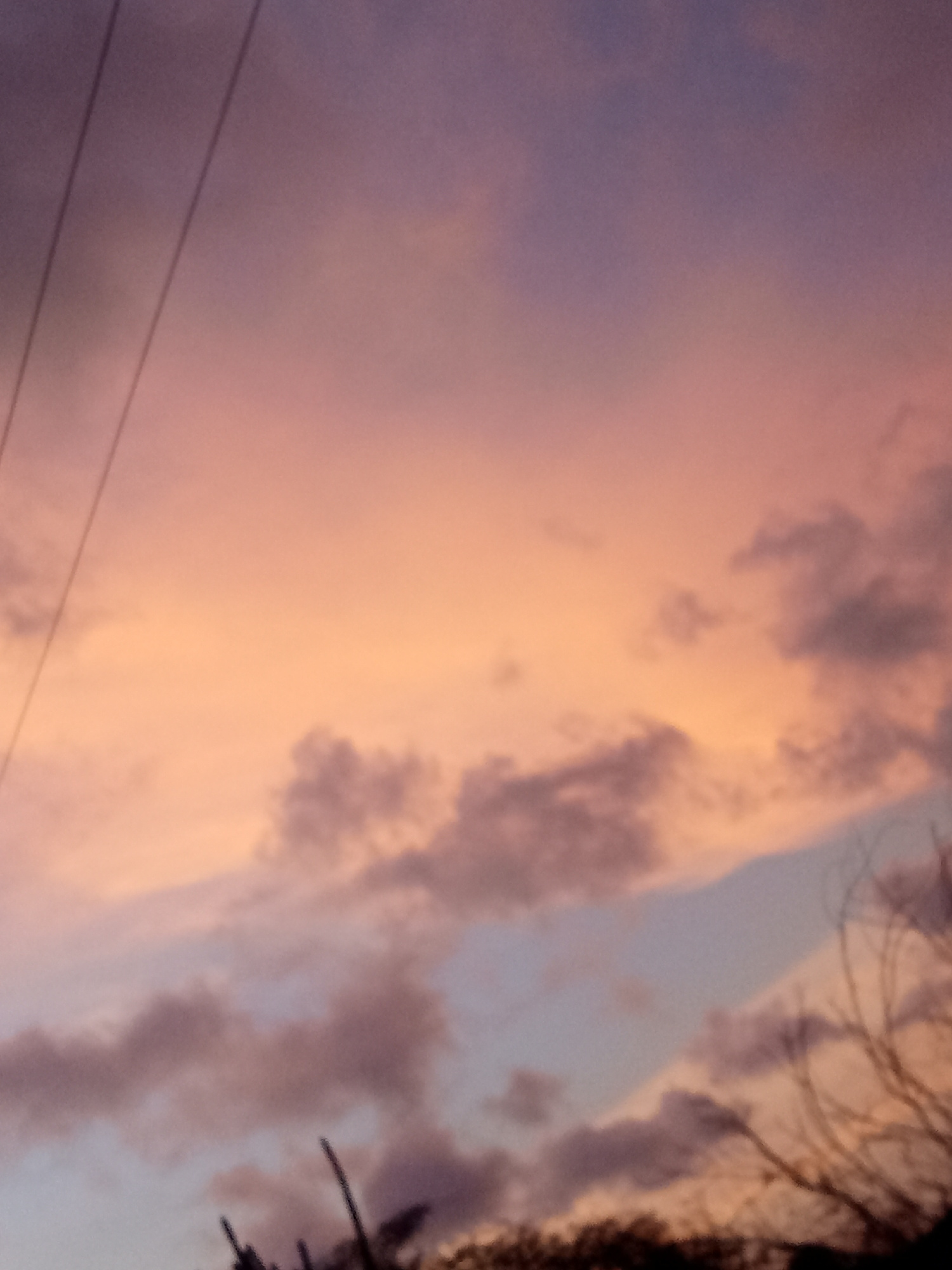 The image depicts a sunset sky over Juan Griego, Venezuela. The sky is a blend of orange, pink, and purple hues, with scattered clouds. Bare branches and silhouettes of vegetation are visible along thβ¦read more