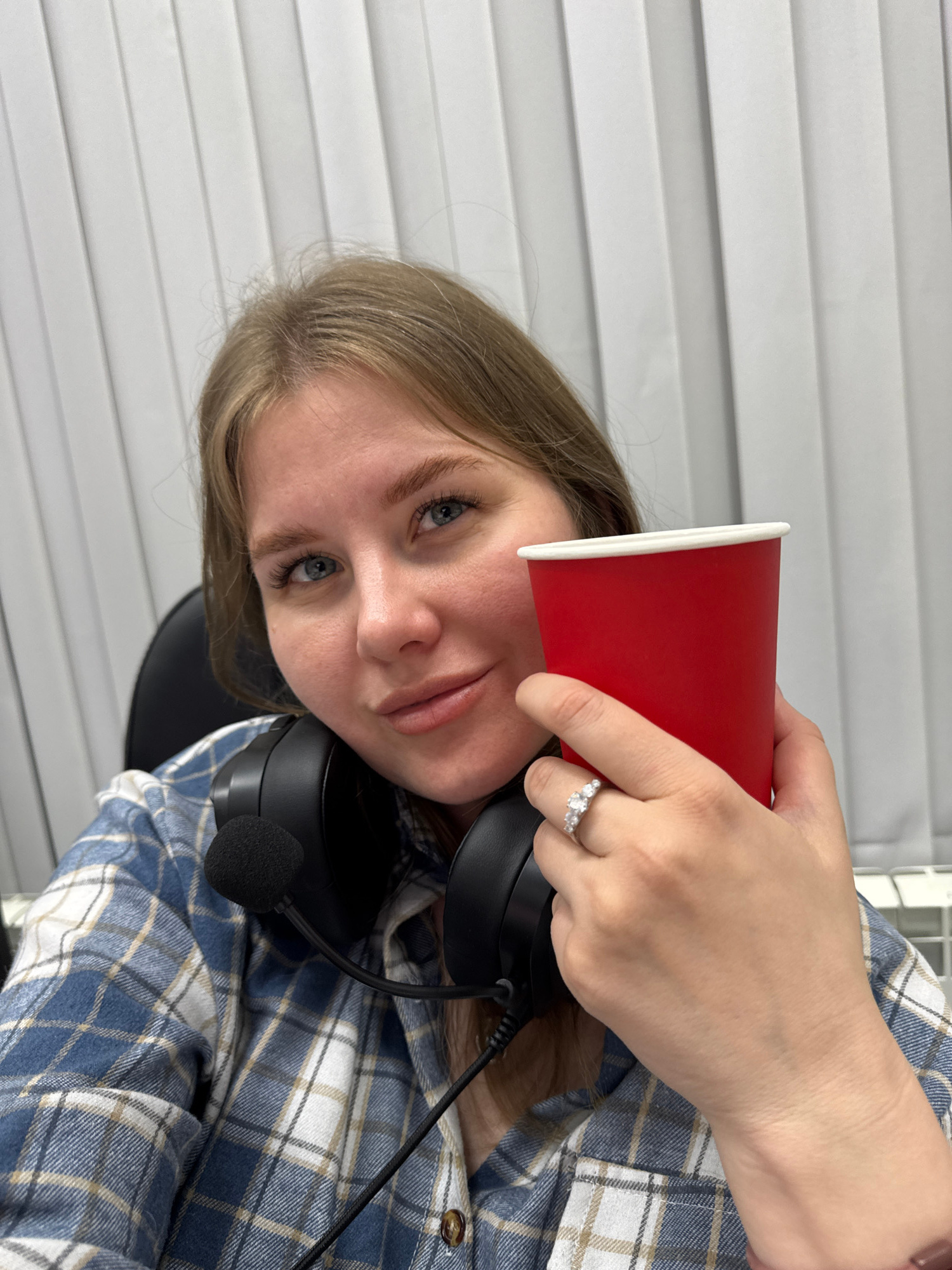 A blonde woman is holding a red paper cup with a white rim next to her face. She is wearing headphones with a microphone and a blue and white plaid shirt with brown buttons. A ring is visible on her l…read more