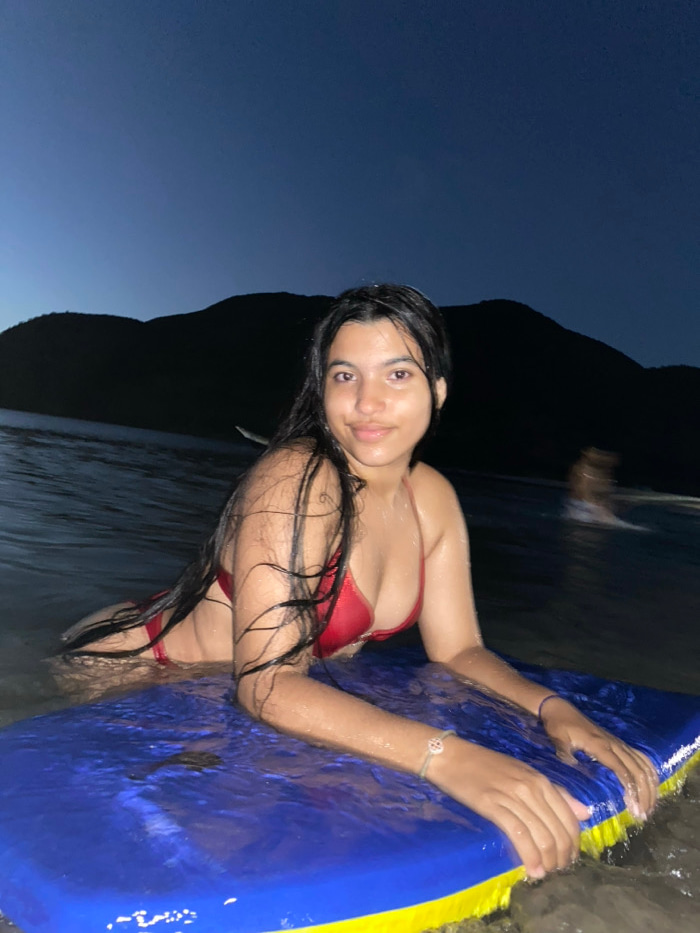 A woman in a red bikini lying on a blue and yellow raft in the water, smiling at the camera. Her dark hair is wet and cascades over her shoulder. She is wearing a bracelet on her left wrist. The backg…read more
