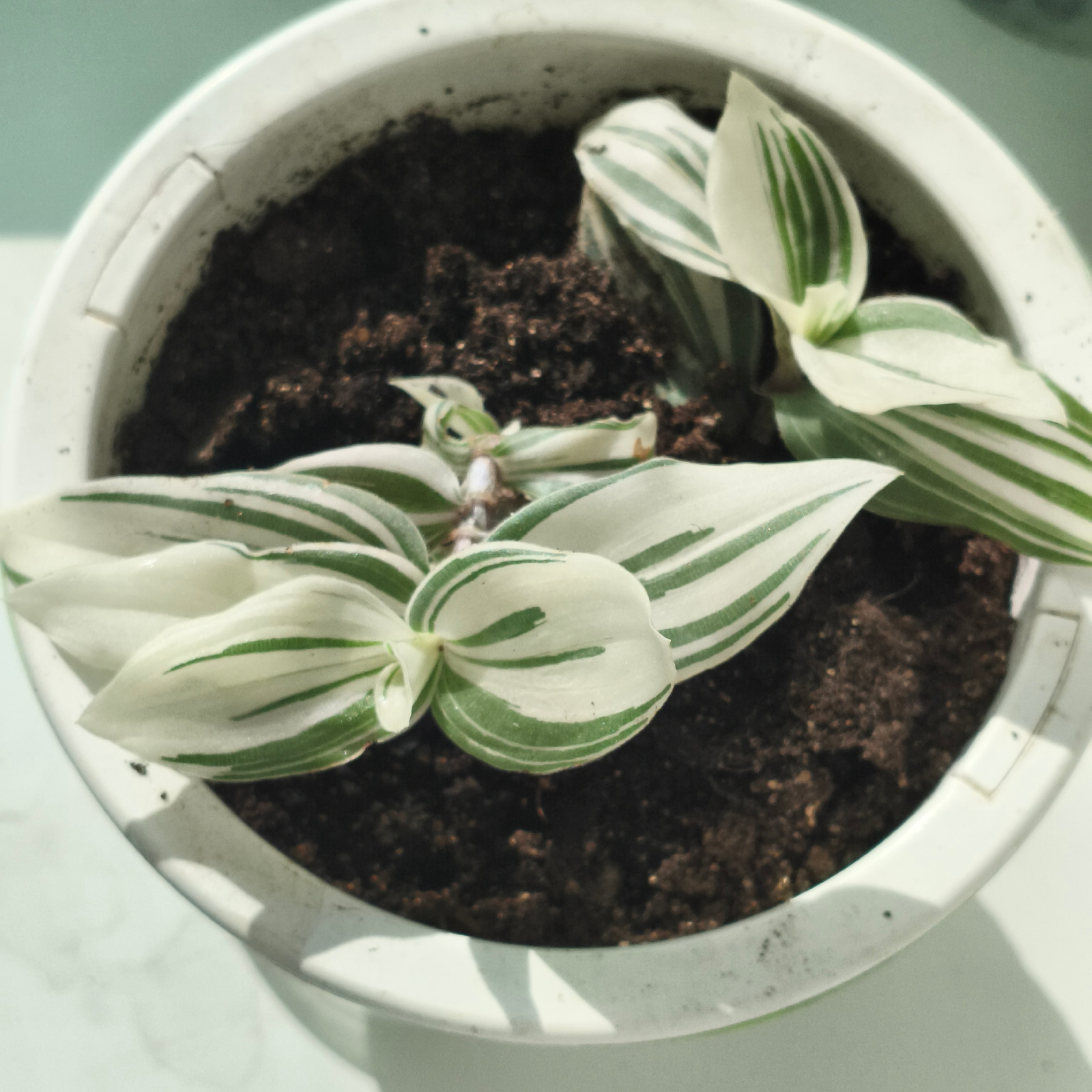 The image presents a top-down, close-up view of a small potted plant housed in a white plastic pot. The plant is characterized by its striking variegated leaves, which feature broad white sections int…read more