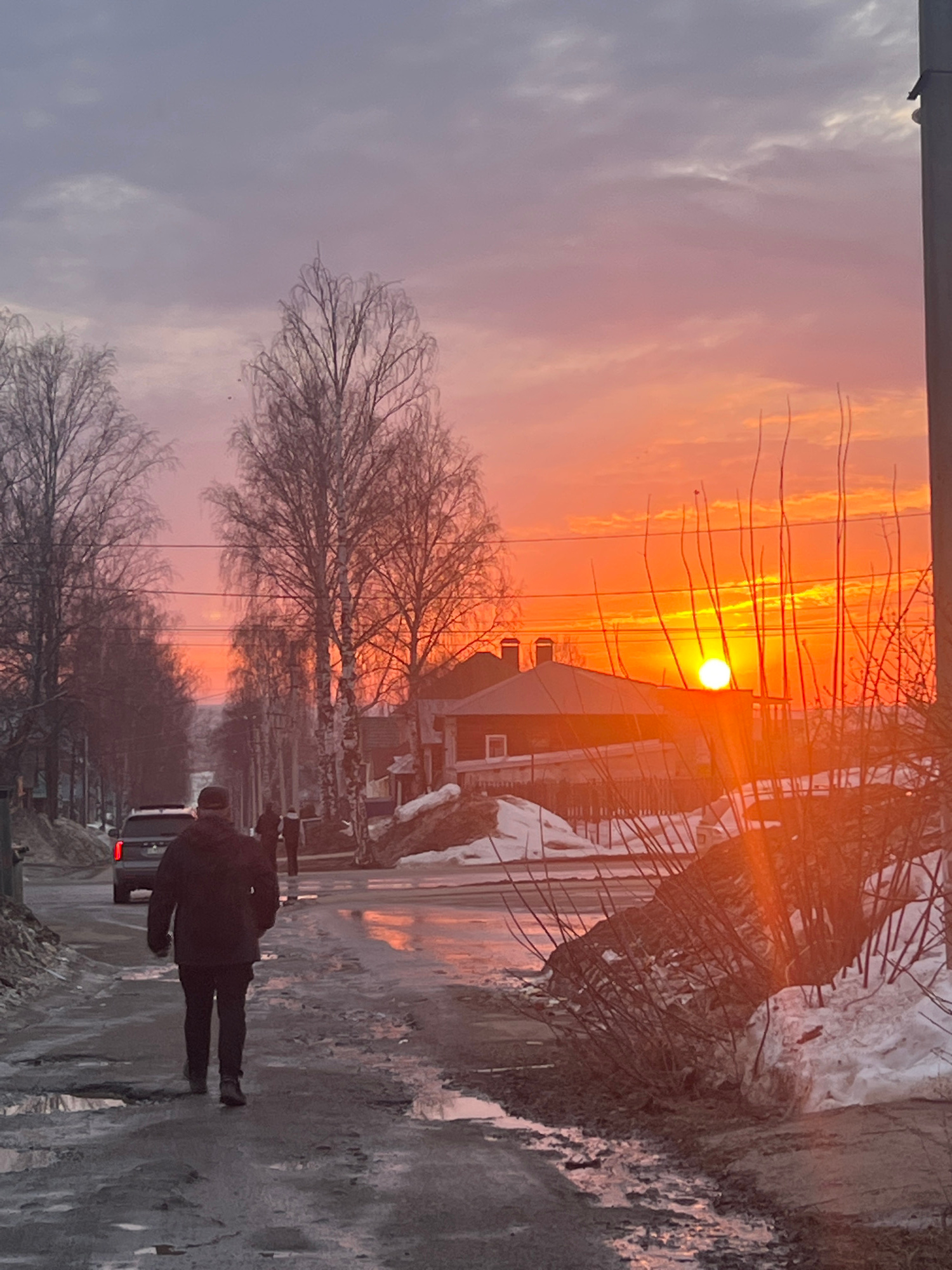 A low-angle, medium shot captures a street scene in Votkinsk, Russia, at sunset. The sky is painted with vivid hues of orange near the horizon, gradually fading into grey clouds overhead. A stark row…read more