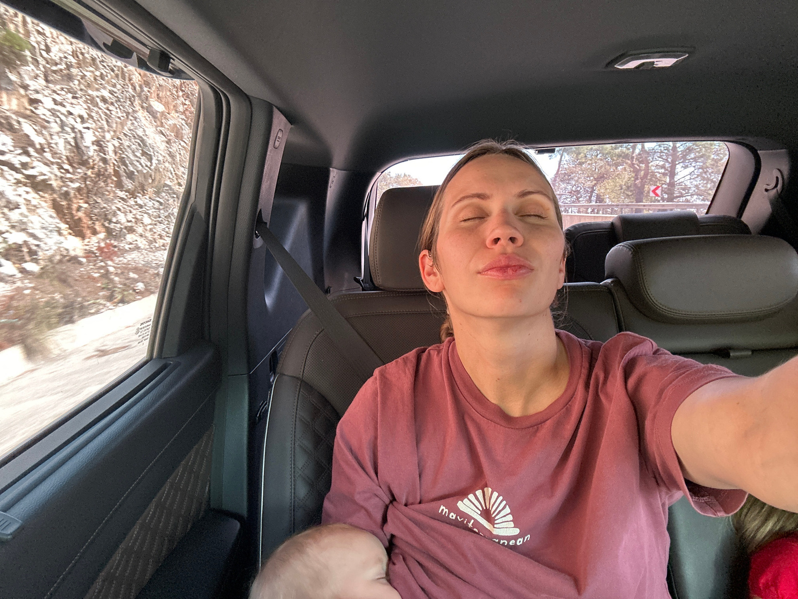 A woman is photographed from inside a vehicle, possibly a car, while nursing a baby. The woman is wearing a burgundy t-shirt and has her eyes closed. She is wearing a seatbelt, suggesting she is a pas…read more