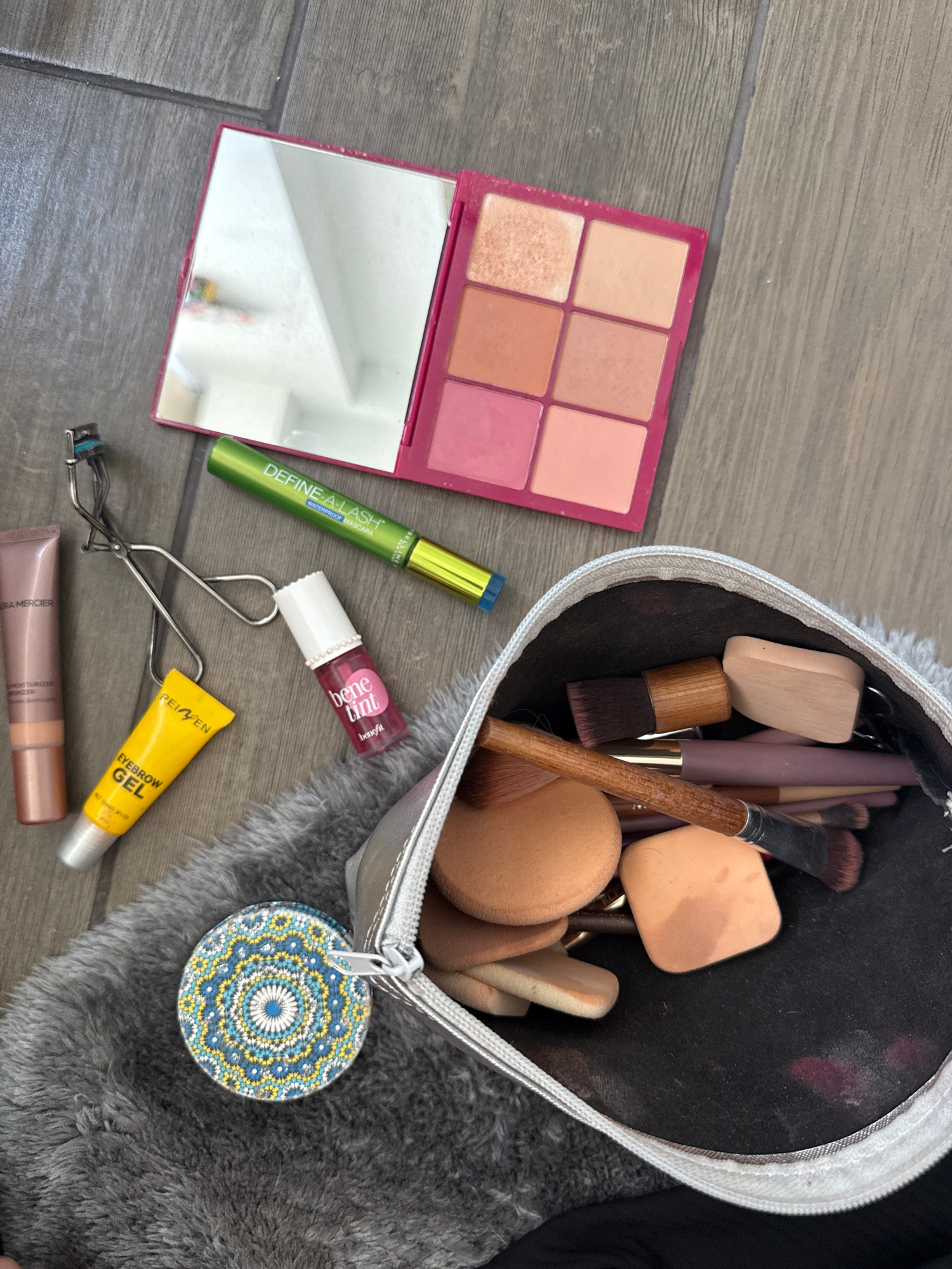 An overhead shot displays a collection of makeup products and accessories laid out on a surface primarily composed of wooden floorboards, with a grey furry rug covering part of the right side. The sce…read more