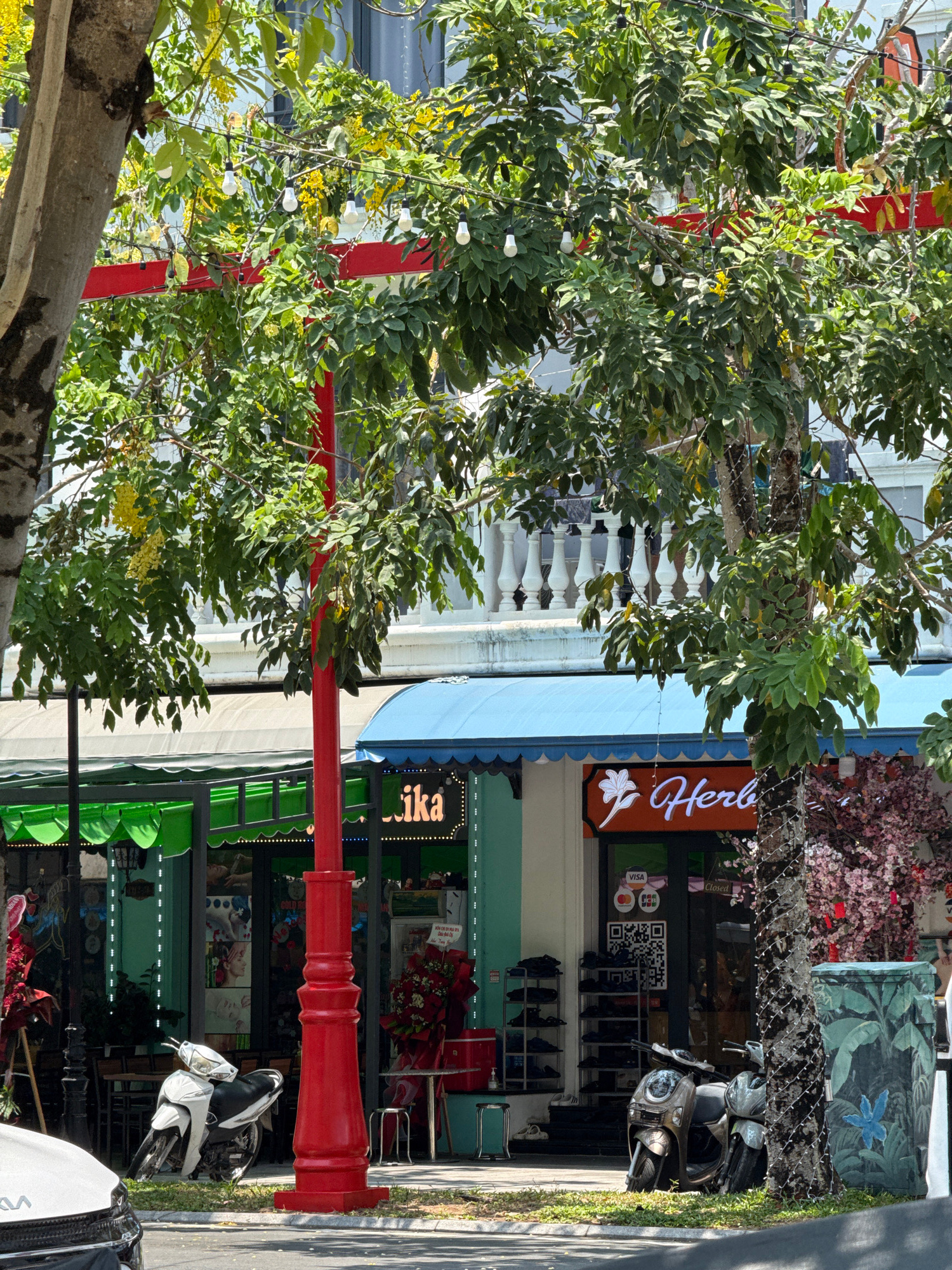 This image presents a vibrant street scene in Phú Quốc, Vietnam, captured on a sunny day. A large tree with dense green foliage and small yellow flowers occupies much of the left side and foreground,…read more