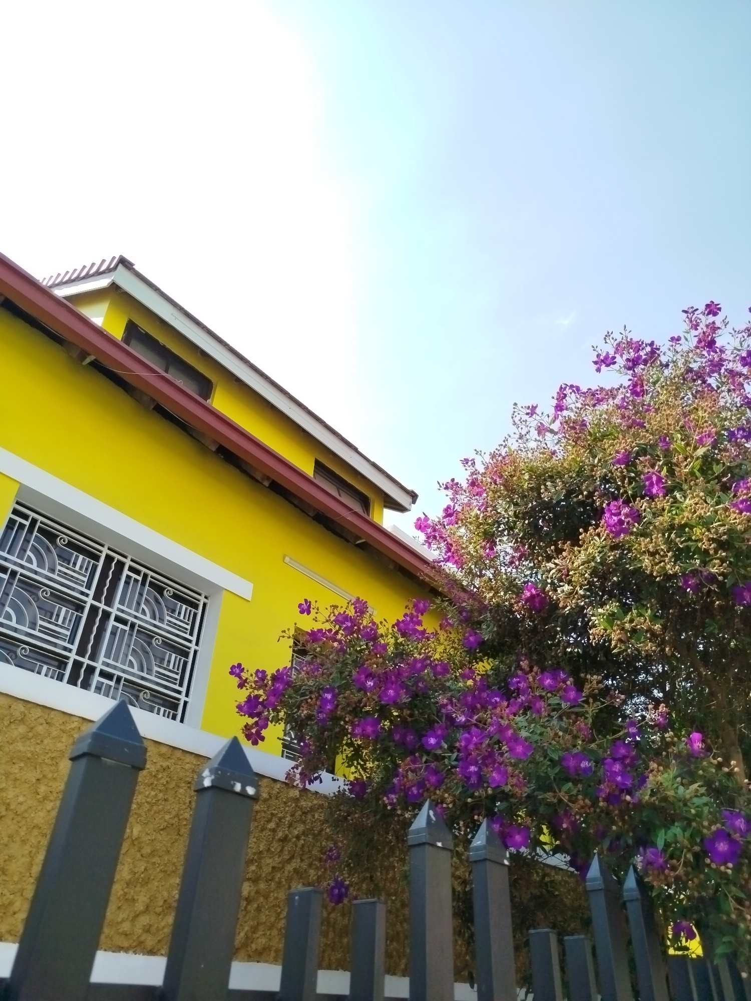 The scene depicts a vibrant yellow two-story building with a brown roof in an urban location, presumably in the city of Unknown, Vietnam. A large flowering tree with purple blossoms occupies the right…read more