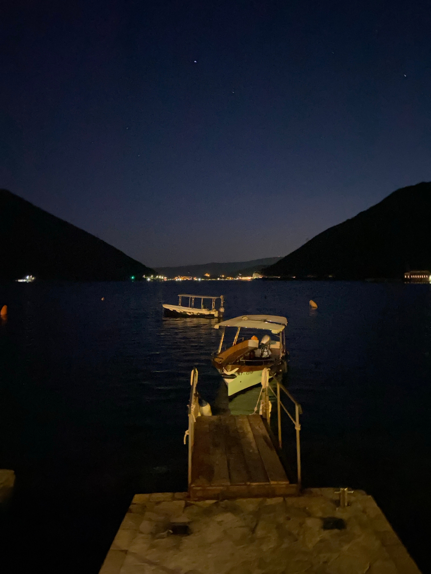 The image shows a nighttime scene in Perast, Montenegro. A small boat is docked alongside a stone pier. The water is dark and calm. In the distance, the lights of Perast are visible along the coastlin…read more