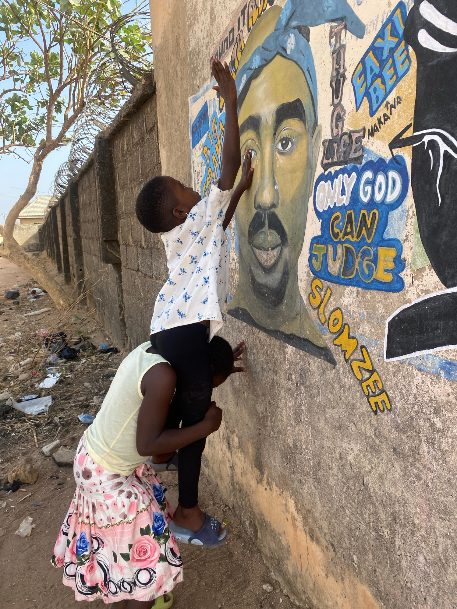 The image shows two children lying on a concrete surface adorned with graffiti, possibly in Rido, Nigeria. The graffiti includes a portrait, the phrases "ONLY GOD CAN JUDGE" and "SLOMZEE", and possibl…read more