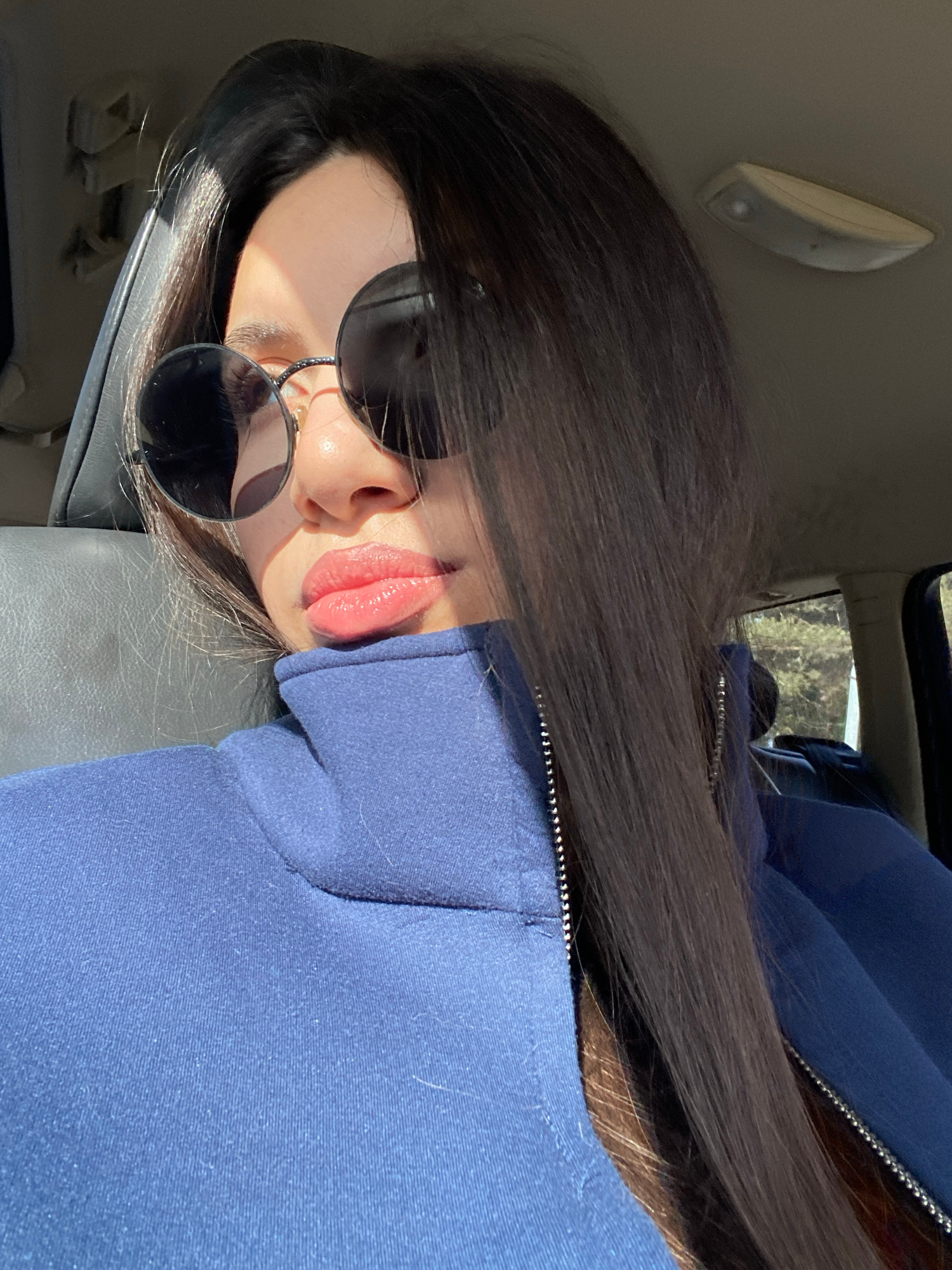 The image shows a person in a car. The person has long, dark hair and is wearing sunglasses and a blue hoodie. The interior of the car is visible, with a light fixture on the ceiling and a window show…read more