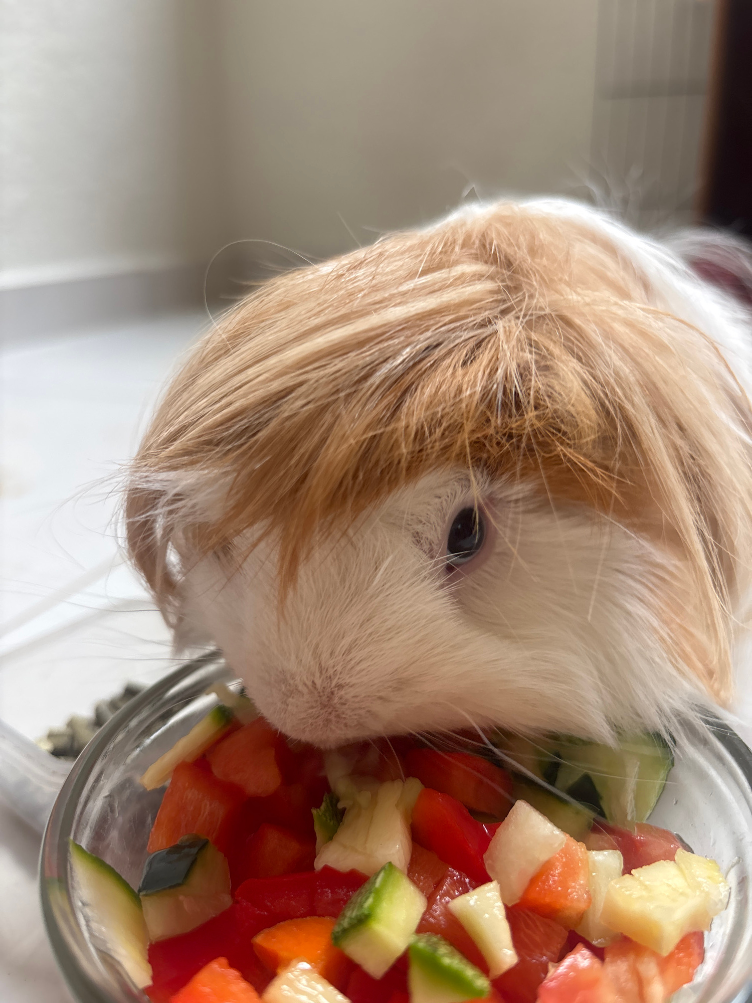 A close-up, eye-level shot depicts a guinea pig with white and tan fur, partially submerged in a glass bowl filled with diced vegetables. The vegetables appear to be a mix of red peppers, cucumber, an…read more