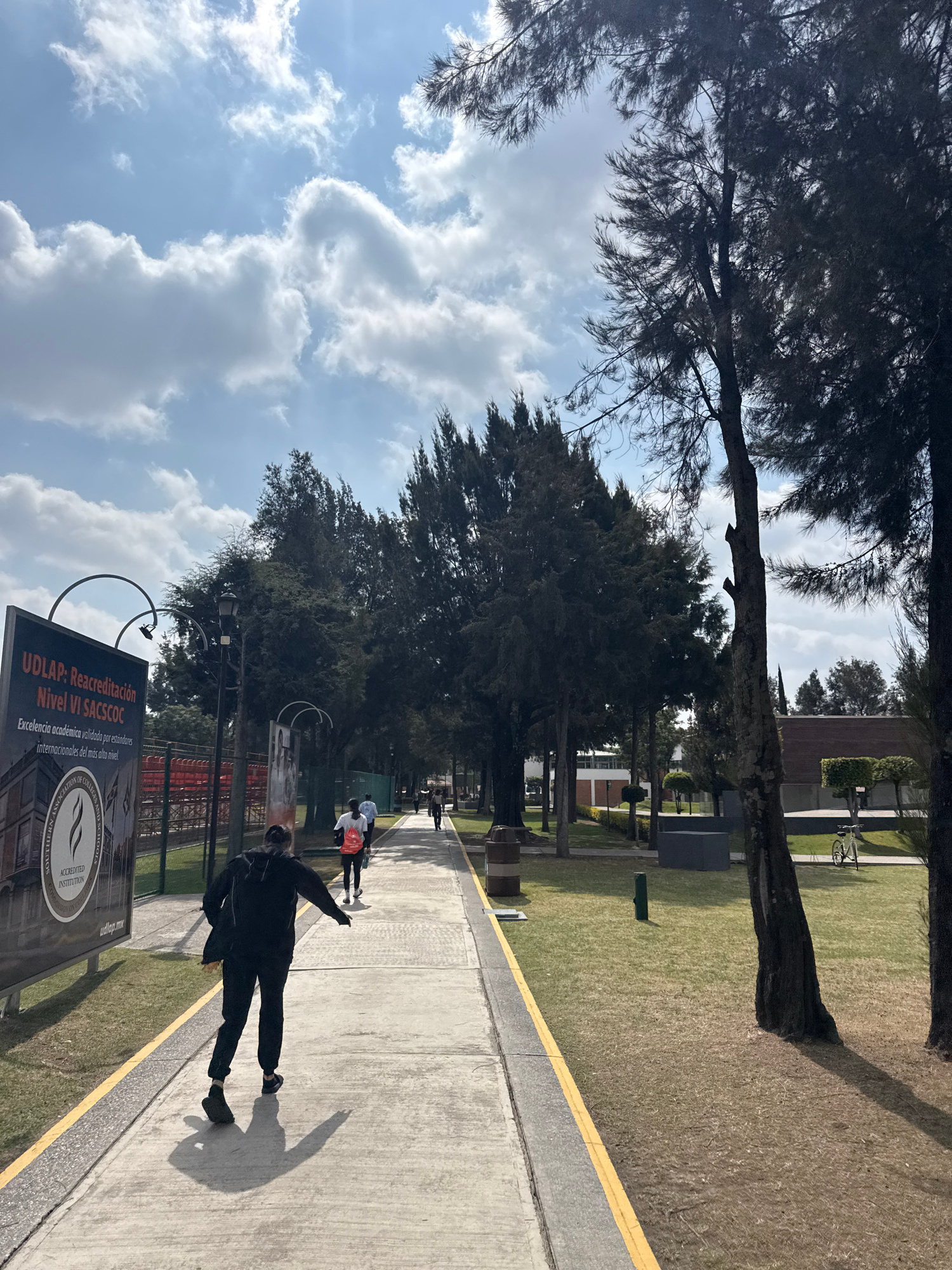 The image depicts a scene at the Universidad de las Américas Puebla (UDLAP) in San Andrés Cholula, Mexico. The view is from the sidewalk, where a person in dark clothing is walking with arms outstretc…read more