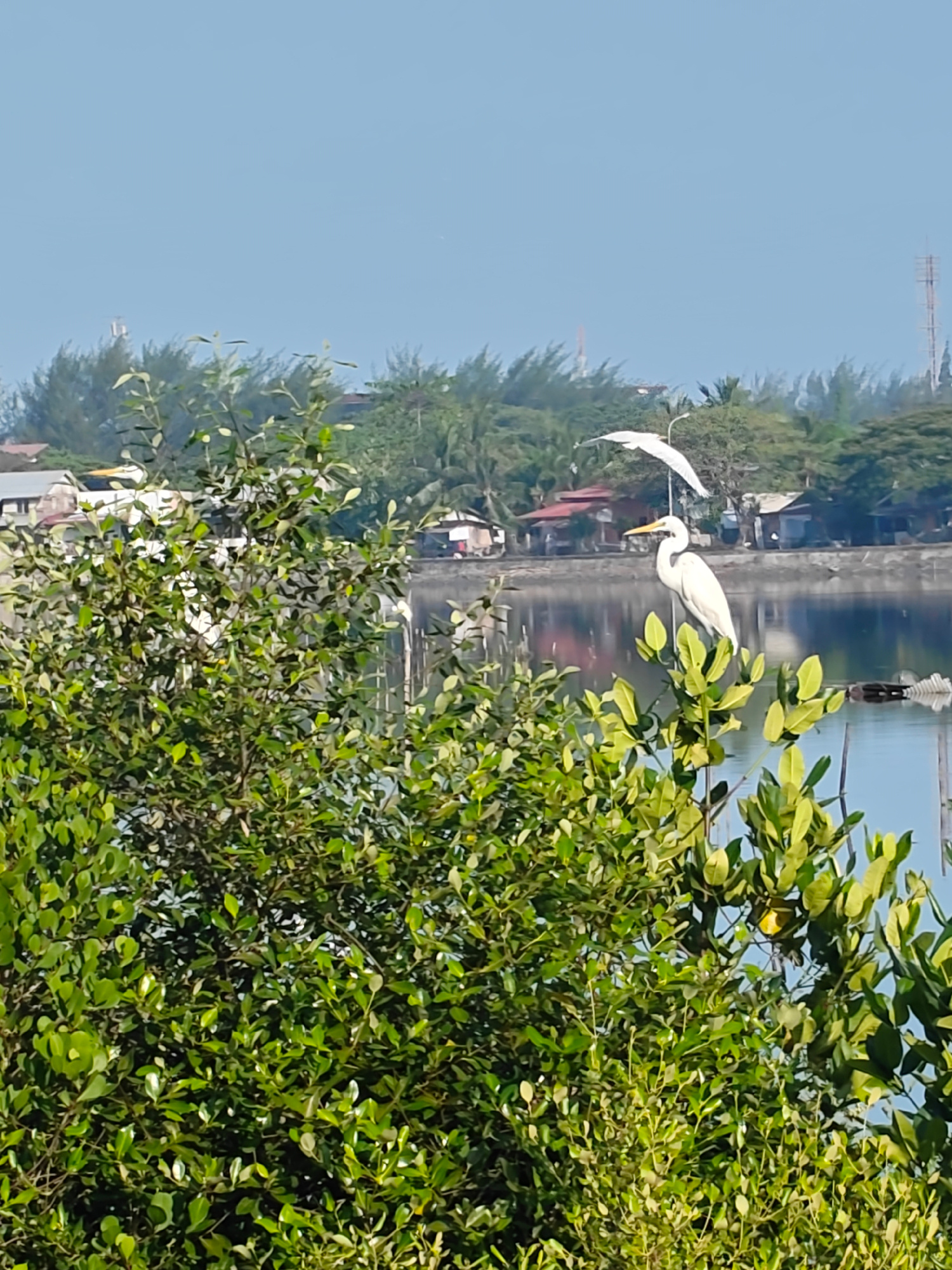 The image depicts a waterfront scene in Lhokseumawe, Indonesia. In the foreground, dense green vegetation occupies the lower portion of the frame. Behind the vegetation, a calm body of water reflects…read more