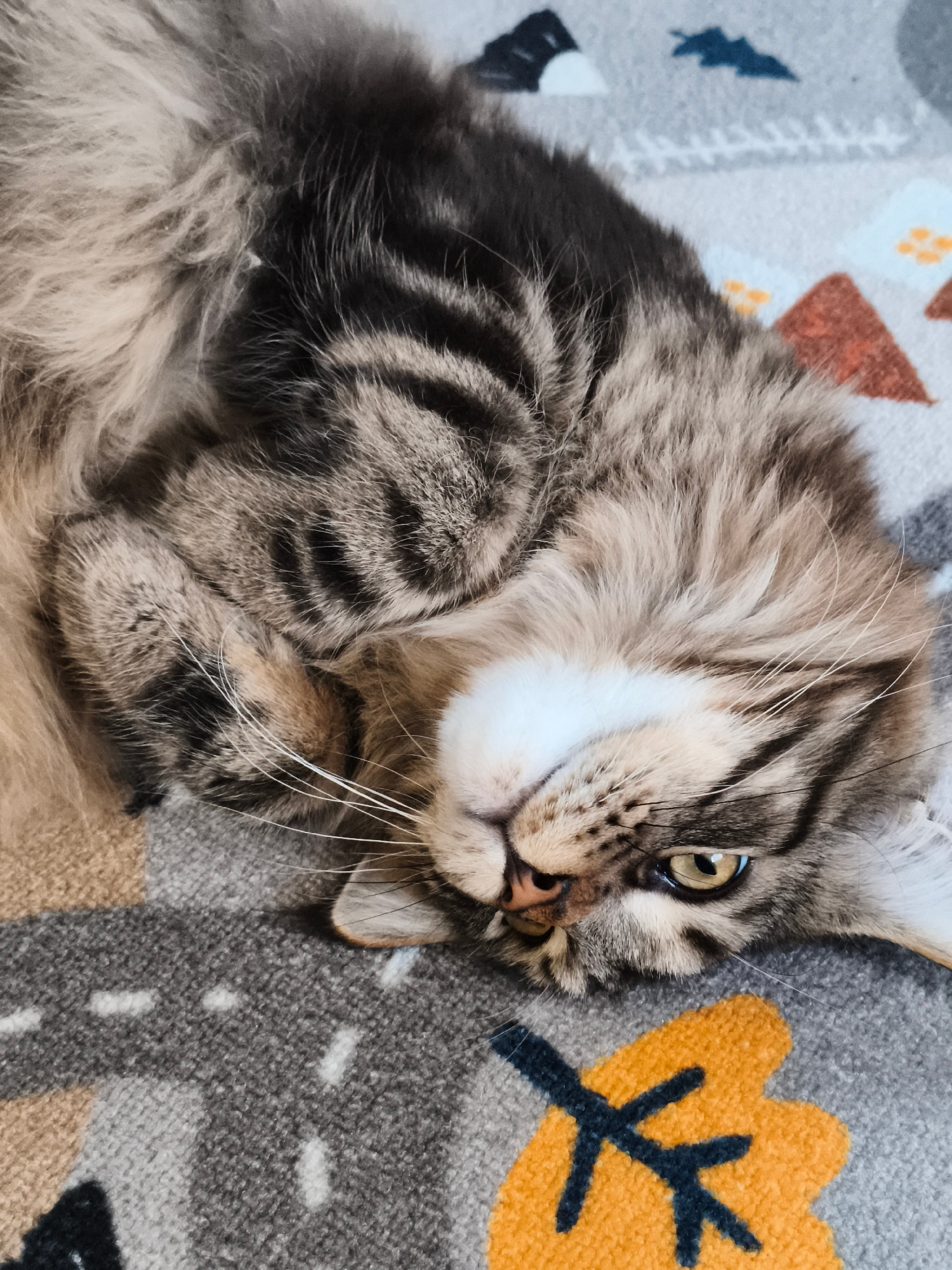 A tabby cat lies on its back on a gray blanket with stylized landscape designs. The blanket features depictions of mountains, trees, and paths in colors such as orange, blue, and white. The cat has a…read more