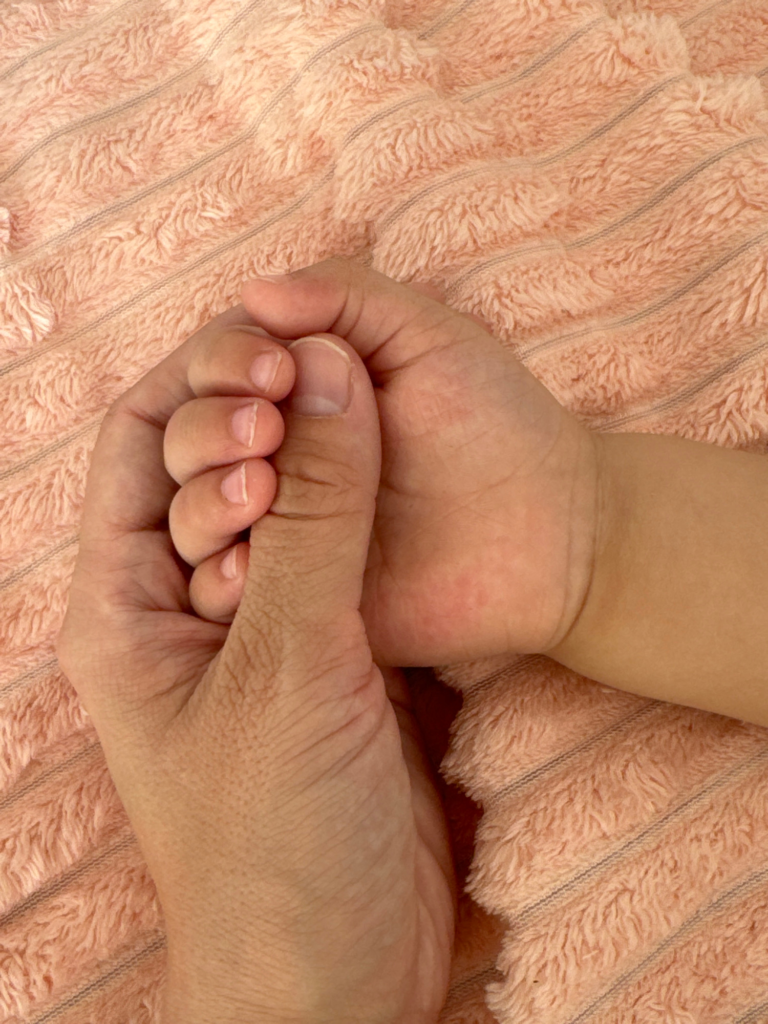 A close-up shot depicts an adult hand holding a baby's hand against a peach-colored, striped fabric background. The adult's hand is slightly wrinkled, while the baby's hand appears smooth. No other el…read more
