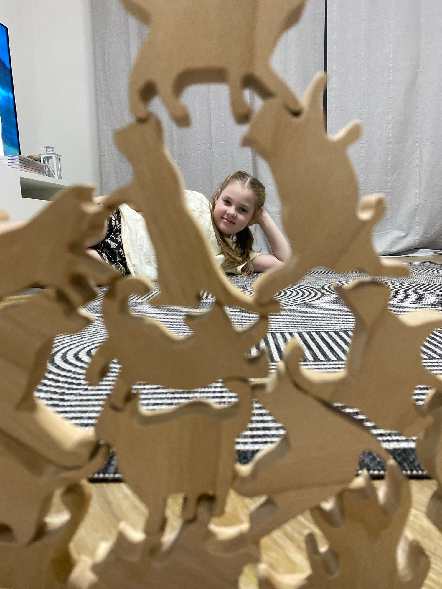 A young girl with blonde hair poses for a photo, viewed through a wooden animal-shaped toy. She is wearing a white blouse and floral shorts. The background includes a striped rug and a white wall. Par…read more
